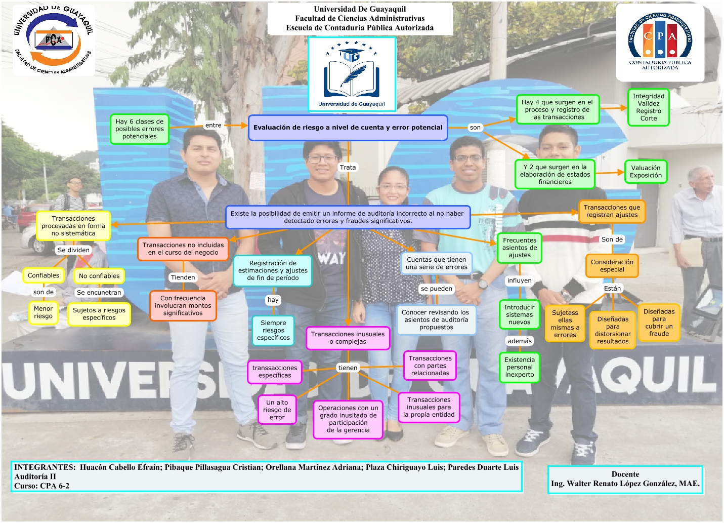 Este Cmap, tiene información relacionada con: EVALUACION DE RIESGO A NIVEL DE CUENTA Y ERROR POTENCIAL, Transacciones inusuales o complejas tienen Transacciones inusuales para la propia entidad, Transacciones inusuales o complejas tienen Un alto riesgo de error, Existe la posibilidad de emitir un informe de auditoría incorrecto al no haber detectado errores y fraudes significativos. Transacciones que registran ajustes, Evaluación de riesgo a nivel de cuenta y error potencial son Hay 4 que surgen en el proceso y registro de las transacciones, Evaluación de riesgo a nivel de cuenta y error potencial Trata Existe la posibilidad de emitir un informe de auditoría incorrecto al no haber detectado errores y fraudes significativos., Frecuentes asientos de ajustes influyen Introducir sistemas nuevos, Existe la posibilidad de emitir un informe de auditoría incorrecto al no haber detectado errores y fraudes significativos. Transacciones no incluidas en el curso del negocio, Hay 4 que surgen en el proceso y registro de las transacciones Integridad Validez Registro Corte, Existe la posibilidad de emitir un informe de auditoría incorrecto al no haber detectado errores y fraudes significativos. Cuentas que tienen una serie de errores, Introducir sistemas nuevos además Existencia personal inexperto, Existe la posibilidad de emitir un informe de auditoría incorrecto al no haber detectado errores y fraudes significativos. Transacciones procesadas en forma no sistemática, Consideración especial Están Diseñadas para cubrir un fraude, Transacciones que registran ajustes Son de Consideración especial, Consideración especial Están Diseñadas para distorsionar resultados, Transacciones inusuales o complejas tienen Operaciones con un grado inusitado de participación de la gerencia, Cuentas que tienen una serie de errores se pueden Conocer revisando los asientos de auditoría propuestos, Consideración especial Están Sujetass ellas mismas a errores, Transacciones procesadas en forma no sistemática Se dividen No confiables, Transacciones inusuales o complejas tienen transsacciones específicas, Registración de estimaciones y ajustes de fin de período hay Siempre riesgos específicos