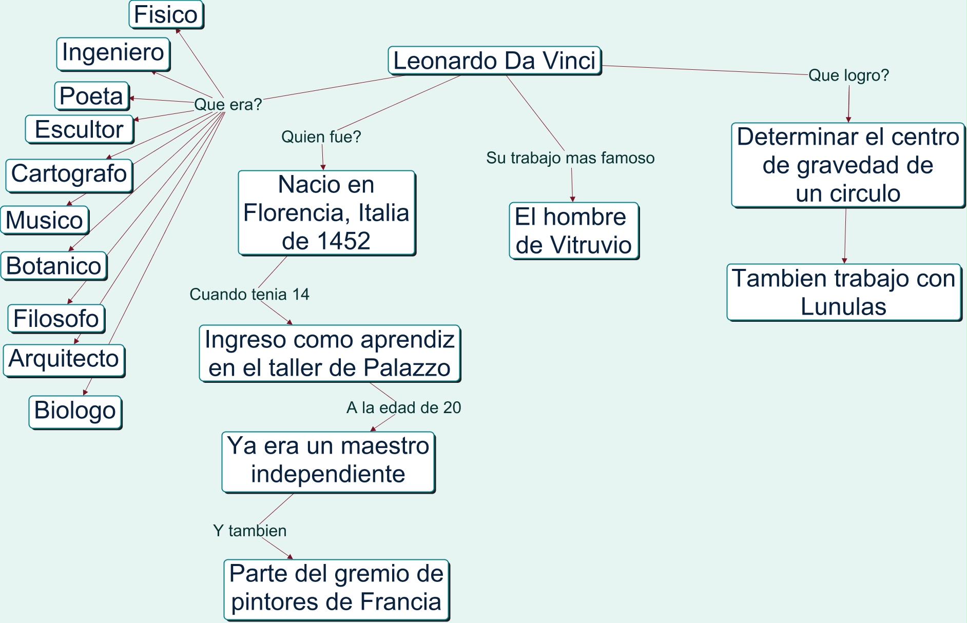 Este Cmap, tiene información relacionada con: Expresion oral, Leonardo Da Vinci Que logro? Tambien trabajo con Lunulas, Leonardo Da Vinci Que era? Fisico, Leonardo Da Vinci Que era? Arquitecto, Leonardo Da Vinci Quien fue? Nacio en Florencia, Italia de 1452, Leonardo Da Vinci Que era? Escultor, Leonardo Da Vinci Que era? Filosofo, Leonardo Da Vinci Que era? Botanico, Leonardo Da Vinci Que era? Cartografo, Nacio en Florencia, Italia de 1452 Cuando tenia 14 Ingreso como aprendiz en el taller de Palazzo, Leonardo Da Vinci Su trabajo mas famoso El hombre de Vitruvio, Leonardo Da Vinci Que era? Musico, Leonardo Da Vinci Que era? Biologo, Ya era un maestro independiente Y tambien Parte del gremio de pintores de Francia, Leonardo Da Vinci Que era? Poeta, Leonardo Da Vinci Que era? Ingeniero, Ingreso como aprendiz en el taller de Palazzo A la edad de 20 Ya era un maestro independiente, Leonardo Da Vinci Que logro? Determinar el centro de gravedad de un circulo