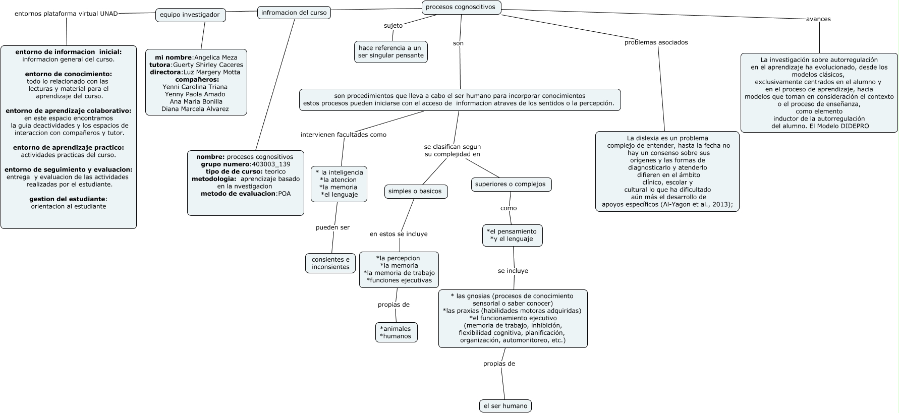 Este Cmap, tiene información relacionada con: procesos cognoscitivos ange, * las gnosias (procesos de conocimiento sensorial o saber conocer) *las praxias (habilidades motoras adquiridas) *el funcionamiento ejecutivo (memoria de trabajo, inhibición, flexibilidad cognitiva, planificación, organización, automonitoreo, etc.) propias de el ser humano, procesos cognoscitivos problemas asociados La dislexia es un problema complejo de entender, hasta la fecha no hay un consenso sobre sus orígenes y las formas de diagnosticarlo y atenderlo difieren en el ámbito clínico, escolar y cultural lo que ha dificultado aún más el desarrollo de apoyos específicos (Al-Yagon et al., 2013);, mi nombre:Angelica Meza tutora:Guerty Shirley Caceres directora:Luz Margery Motta compañeros: Yenni Carolina Triana Yenny Paola Amado Ana Maria Bonilla Diana Marcela Alvarez ?? equipo investigador, nombre: procesos cognositivos grupo numero:403003_139 tipo de de curso: teorico metodologia: aprendizaje basado en la nvestigacion metodo de evaluacion:POA ???? infromacion del curso, procesos cognoscitivos avances La investigación sobre autorregulación en el aprendizaje ha evolucionado, desde los modelos clásicos, exclusivamente centrados en el alumno y en el proceso de aprendizaje, hacia modelos que toman en consideración el contexto o el proceso de enseñanza, como elemento inductor de la autorregulación del alumno. El Modelo DIDEPRO, son procedimientos que lleva a cabo el ser humano para incorporar conocimientos estos procesos pueden iniciarse con el acceso de informacion atraves de los sentidos o la percepción. intervienen facultades como * la inteligencia *la atencion *la memoria *el lenguaje, * la inteligencia *la atencion *la memoria *el lenguaje pueden ser consientes e inconsientes, *el pensamiento *y el lenguaje se incluye * las gnosias (procesos de conocimiento sensorial o saber conocer) *las praxias (habilidades motoras adquiridas) *el funcionamiento ejecutivo (memoria de trabajo, inhibición, flexibilidad cognitiva, planificación, organización, automonitoreo, etc.), procesos cognoscitivos entornos plataforma virtual UNAD entorno de informacion inicial: informacion general del curso. entorno de conocimiento: todo lo relacionado con las lecturas y material para el aprendizaje del curso. entorno de aprendizaje colaborativo: en este espacio encontramos la guia deactividades y los espacios de interaccion con compañeros y tutor. entorno de aprendizaje practico: actividades practicas del curso. entorno de seguimiento y evaluacion: entrega y evaluacion de las actividades realizadas por el estudiante. gestion del estudiante: orientacion al estudiante, simples o basicos en estos se incluye *la percepcion *la memoria *la memoria de trabajo *funciones ejecutivas, superiores o complejos como *el pensamiento *y el lenguaje, son procedimientos que lleva a cabo el ser humano para incorporar conocimientos estos procesos pueden iniciarse con el acceso de informacion atraves de los sentidos o la percepción. se clasifican segun su complejidad en superiores o complejos, procesos cognoscitivos sujeto hace referencia a un ser singular pensante, son procedimientos que lleva a cabo el ser humano para incorporar conocimientos estos procesos pueden iniciarse con el acceso de informacion atraves de los sentidos o la percepción. se clasifican segun su complejidad en simples o basicos, *la percepcion *la memoria *la memoria de trabajo *funciones ejecutivas propias de *animales *humanos, procesos cognoscitivos son son procedimientos que lleva a cabo el ser humano para incorporar conocimientos estos procesos pueden iniciarse con el acceso de informacion atraves de los sentidos o la percepción.