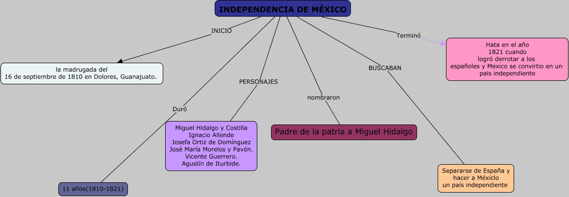 Este Cmap, tiene información relacionada con: idependencia, INDEPENDENCIA DE MÉXICO PERSONAJES Miguel Hidalgo y Costilla Ignacio Allende Josefa Ortiz de Domínguez José María Morelos y Pavón. Vicente Guerrero. Agustín de Iturbide., INDEPENDENCIA DE MÉXICO Duró 11 años(1810-1821), INDEPENDENCIA DE MÉXICO INICIO la madrugada del 16 de septiembre de 1810 en Dolores, Guanajuato., INDEPENDENCIA DE MÉXICO nombraron Padre de la patria a Miguel Hidalgo, INDEPENDENCIA DE MÉXICO Terminó Hata en el año 1821 cuando logró derrotar a los españoles y Mexico se convirtio en un pais independiente, INDEPENDENCIA DE MÉXICO BUSCABAN Separarse de España y hacer a Méxiclo un país independiente