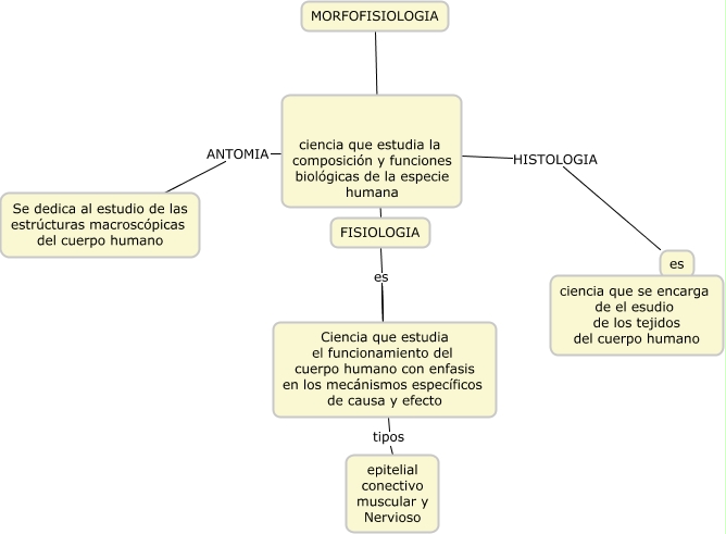 Este Cmap, tiene información relacionada con: lili morfo, Ciencia que estudia el funcionamiento del cuerpo humano con enfasis en los mecánismos específicos de causa y efecto tipos epitelial conectivo muscular y Nervioso, FISIOLOGIA es Ciencia que estudia el funcionamiento del cuerpo humano con enfasis en los mecánismos específicos de causa y efecto, FISIOLOGIA es Ciencia que estudia el funcionamiento del cuerpo humano con enfasis en los mecánismos específicos de causa y efecto, ciencia que estudia la composición y funciones biológicas de la especie humana ANTOMIA Se dedica al estudio de las estrúcturas macroscópicas del cuerpo humano, ciencia que estudia la composición y funciones biológicas de la especie humana HISTOLOGIA es, MORFOFISIOLOGIA ???? FISIOLOGIA, FISIOLOGIA es