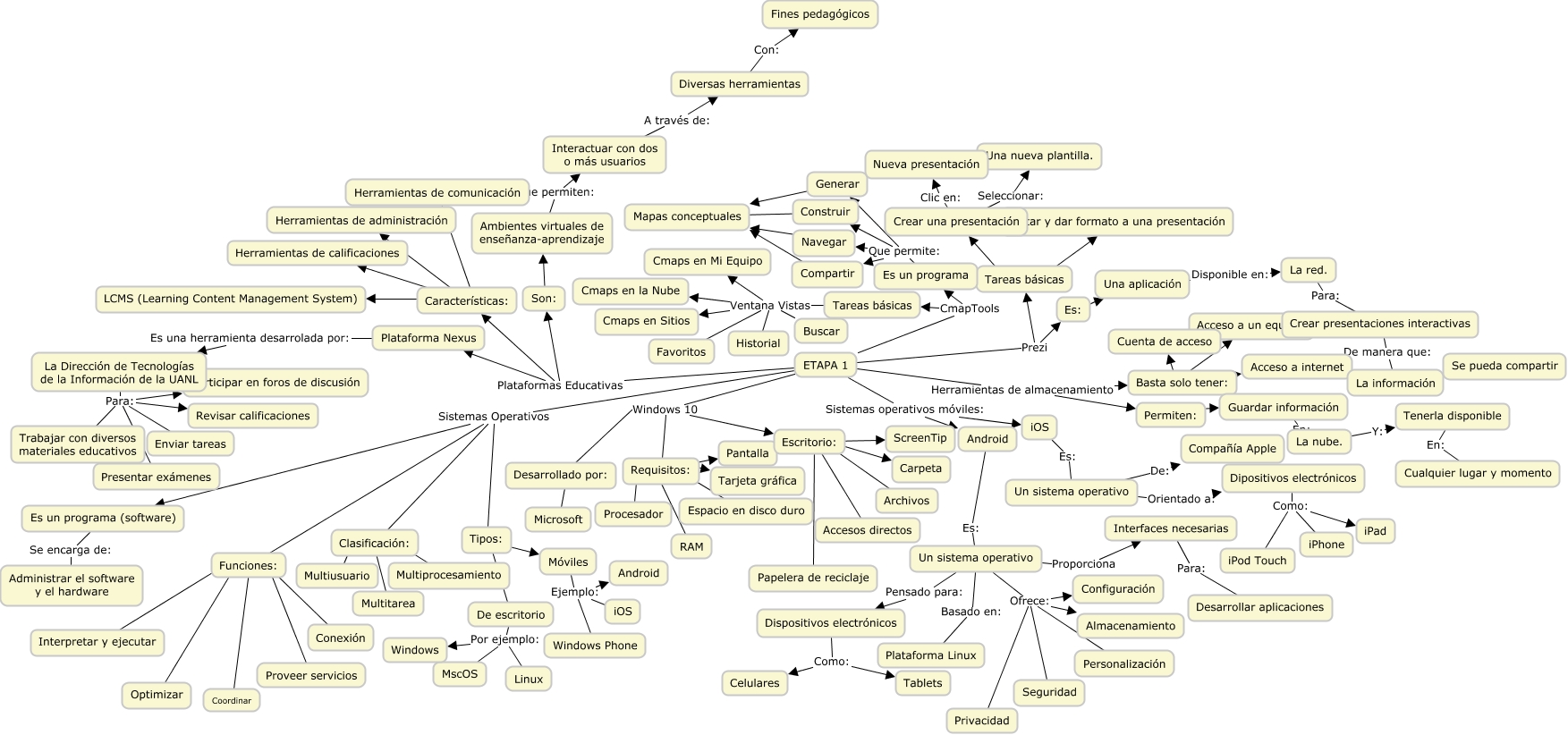 Este Cmap, tiene información relacionada con: Etapa 1 TIC, ETAPA 1 Herramientas de almacenamiento Basta solo tener:, Características: ???? Herramientas de calificaciones, La Dirección de Tecnologías de la Información de la UANL Para: Trabajar con diversos materiales educativos, Escritorio: ???? Accesos directos, Escritorio: ???? Carpeta, Es un programa Que permite: Generar, Es un programa Que permite: Construir, ETAPA 1 Plataformas Educativas Plataforma Nexus, Móviles Ejemplo: iOS, Funciones: ???? Proveer servicios, Requisitos: ???? Procesador, Una aplicación Disponible en: La red., La nube. Y: Tenerla disponible, Un sistema operativo Orientado a: Dipositivos electrónicos, Es: ???? Una aplicación, Desarrollado por: ???? Microsoft, Dispositivos electrónicos Como: Tablets, Funciones: ???? Interpretar y ejecutar, Basta solo tener: ???? Acceso a un equipo., Es un programa Que permite: Navegar