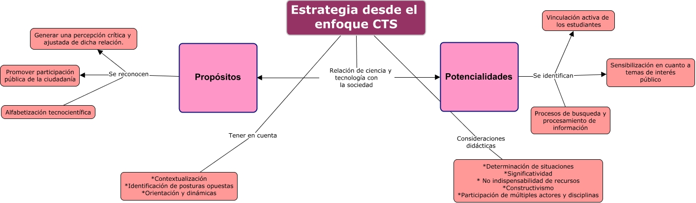 Este Cmap, tiene información relacionada con: Estrategia desde el enfoque CTS, Potencialidades Se identifican Procesos de busqueda y procesamiento de información, Estrategia desde el enfoque CTS Consideraciones didácticas *Determinación de situaciones *Significatividad * No indispensabilidad de recursos *Constructivismo *Participación de múltiples actores y disciplinas, Estrategia desde el enfoque CTS Relación de ciencia y tecnología con la sociedad Potencialidades, Estrategia desde el enfoque CTS Tener en cuenta *Contextualización *Identificación de posturas opuestas *Orientación y dinámicas, Propósitos Se reconocen Generar una percepción crítica y ajustada de dicha relación., Propósitos Se reconocen Alfabetización tecnocientífica, Potencialidades Se identifican Sensibilización en cuanto a temas de interés público, Propósitos Se reconocen Promover participación pública de la ciudadanía, Potencialidades Se identifican Vinculación activa de los estudiantes, Estrategia desde el enfoque CTS Relación de ciencia y tecnología con la sociedad Propósitos