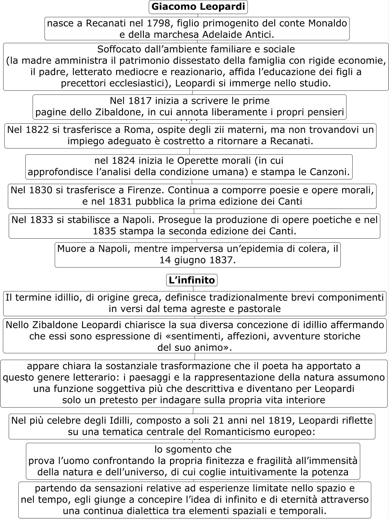 Questa Cmap, creata con IHMC CmapTools, contiene informazioni relative a: 122leopardi, Nel 1817 inizia a scrivere le prime pagine dello Zibaldone, in cui annota liberamente i propri pensieri ???? Nel 1822 si trasferisce a Roma, ospite degli zii materni, ma non trovandovi un impiego adeguato è costretto a ritornare a Recanati., lo sgomento che prova l’uomo confrontando la propria finitezza e fragilità all’immensità della natura e dell’universo, di cui coglie intuitivamente la potenza ???? partendo da sensazioni relative ad esperienze limitate nello spazio e nel tempo, egli giunge a concepire l’idea di infinito e di eternità attraverso una continua dialettica tra elementi spaziali e temporali., Soffocato dall’ambiente familiare e sociale (la madre amministra il patrimonio dissestato della famiglia con rigide economie, il padre, letterato mediocre e reazionario, affida l’educazione dei figli a precettori ecclesiastici), Leopardi si immerge nello studio. ???? Nel 1817 inizia a scrivere le prime pagine dello Zibaldone, in cui annota liberamente i propri pensieri, nel 1824 inizia le Operette morali (in cui approfondisce l’analisi della condizione umana) e stampa le Canzoni. ???? Nel 1830 si trasferisce a Firenze. Continua a comporre poesie e opere morali, e nel 1831 pubblica la prima edizione dei Canti, Giacomo Leopardi ???? nasce a Recanati nel 1798, figlio primogenito del conte Monaldo e della marchesa Adelaide Antici., Nel 1822 si trasferisce a Roma, ospite degli zii materni, ma non trovandovi un impiego adeguato è costretto a ritornare a Recanati. ???? nel 1824 inizia le Operette morali (in cui approfondisce l’analisi della condizione umana) e stampa le Canzoni., Nel più celebre degli Idilli, composto a soli 21 anni nel 1819, Leopardi riflette su una tematica centrale del Romanticismo europeo: ???? lo sgomento che prova l’uomo confrontando la propria finitezza e fragilità all’immensità della natura e dell’universo, di cui coglie intuitivamente la potenza, Nel 1830 si trasferisce a Firenze. Continua a comporre poesie e opere morali, e nel 1831 pubblica la prima edizione dei Canti ???? Nel 1833 si stabilisce a Napoli. Prosegue la produzione di opere poetiche e nel 1835 stampa la seconda edizione dei Canti., appare chiara la sostanziale trasformazione che il poeta ha apportato a questo genere letterario: i paesaggi e la rappresentazione della natura assumono una funzione soggettiva più che descrittiva e diventano per Leopardi solo un pretesto per indagare sulla propria vita interiore ???? Nel più celebre degli Idilli, composto a soli 21 anni nel 1819, Leopardi riflette su una tematica centrale del Romanticismo europeo:, nasce a Recanati nel 1798, figlio primogenito del conte Monaldo e della marchesa Adelaide Antici. ???? Soffocato dall’ambiente familiare e sociale (la madre amministra il patrimonio dissestato della famiglia con rigide economie, il padre, letterato mediocre e reazionario, affida l’educazione dei figli a precettori ecclesiastici), Leopardi si immerge nello studio., L’infinito ???? Il termine idillio, di origine greca, definisce tradizionalmente brevi componimenti in versi dal tema agreste e pastorale, Nel 1833 si stabilisce a Napoli. Prosegue la produzione di opere poetiche e nel 1835 stampa la seconda edizione dei Canti. ???? Muore a Napoli, mentre imperversa un’epidemia di colera, il 14 giugno 1837., Il termine idillio, di origine greca, definisce tradizionalmente brevi componimenti in versi dal tema agreste e pastorale ???? Nello Zibaldone Leopardi chiarisce la sua diversa concezione di idillio affermando che essi sono espressione di «sentimenti, affezioni, avventure storiche del suo animo»., Nello Zibaldone Leopardi chiarisce la sua diversa concezione di idillio affermando che essi sono espressione di «sentimenti, affezioni, avventure storiche del suo animo». ???? appare chiara la sostanziale trasformazione che il poeta ha apportato a questo genere letterario: i paesaggi e la rappresentazione della natura assumono una funzione soggettiva più che descrittiva e diventano per Leopardi solo un pretesto per indagare sulla propria vita interiore