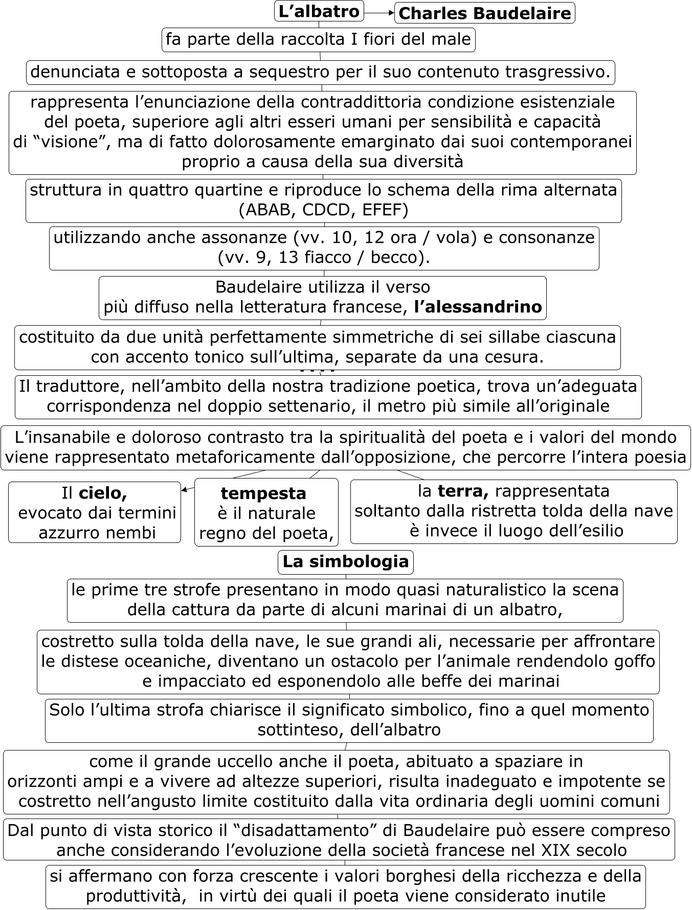 Questa Cmap, creata con IHMC CmapTools, contiene informazioni relative a: 90 baudelaire, costretto sulla tolda della nave, le sue grandi ali, necessarie per affrontare le distese oceaniche, diventano un ostacolo per l’animale rendendolo goffo e impacciato ed esponendolo alle beffe dei marinai ???? Solo l’ultima strofa chiarisce il significato simbolico, fino a quel momento sottinteso, dell’albatro, le prime tre strofe presentano in modo quasi naturalistico la scena della cattura da parte di alcuni marinai di un albatro, ???? costretto sulla tolda della nave, le sue grandi ali, necessarie per affrontare le distese oceaniche, diventano un ostacolo per l’animale rendendolo goffo e impacciato ed esponendolo alle beffe dei marinai, denunciata e sottoposta a sequestro per il suo contenuto trasgressivo. ???? rappresenta l’enunciazione della contraddittoria condizione esistenziale del poeta, superiore agli altri esseri umani per sensibilità e capacità di “visione�?, ma di fatto dolorosamente emarginato dai suoi contemporanei proprio a causa della sua diversità, come il grande uccello anche il poeta, abituato a spaziare in orizzonti ampi e a vivere ad altezze superiori, risulta inadeguato e impotente se costretto nell’angusto limite costituito dalla vita ordinaria degli uomini comuni ???? Dal punto di vista storico il “disadattamento�? di Baudelaire può essere compreso anche considerando l’evoluzione della società francese nel XIX secolo, La simbologia ???? le prime tre strofe presentano in modo quasi naturalistico la scena della cattura da parte di alcuni marinai di un albatro,, costituito da due unità perfettamente simmetriche di sei sillabe ciascuna con accento tonico sull’ultima, separate da una cesura. ???? Il traduttore, nell’ambito della nostra tradizione poetica, trova un’adeguata corrispondenza nel doppio settenario, il metro più simile all’originale, rappresenta l’enunciazione della contraddittoria condizione esistenziale del poeta, superiore agli altri esseri umani per sensibilità e capacità di “visione�?, ma di fatto dolorosamente emarginato dai suoi contemporanei proprio a causa della sua diversità ???? struttura in quattro quartine e riproduce lo schema della rima alternata (ABAB, CDCD, EFEF), Solo l’ultima strofa chiarisce il significato simbolico, fino a quel momento sottinteso, dell’albatro ???? come il grande uccello anche il poeta, abituato a spaziare in orizzonti ampi e a vivere ad altezze superiori, risulta inadeguato e impotente se costretto nell’angusto limite costituito dalla vita ordinaria degli uomini comuni, L’insanabile e doloroso contrasto tra la spiritualità del poeta e i valori del mondo viene rappresentato metaforicamente dall’opposizione, che percorre l’intera poesia ???? la terra, rappresentata soltanto dalla ristretta tolda della nave è invece il luogo dell’esilio, L’insanabile e doloroso contrasto tra la spiritualità del poeta e i valori del mondo viene rappresentato metaforicamente dall’opposizione, che percorre l’intera poesia ???? tempesta è il naturale regno del poeta,, L’insanabile e doloroso contrasto tra la spiritualità del poeta e i valori del mondo viene rappresentato metaforicamente dall’opposizione, che percorre l’intera poesia ???? Il cielo, evocato dai termini azzurro nembi, Baudelaire utilizza il verso più diffuso nella letteratura francese, l’alessandrino ???? costituito da due unità perfettamente simmetriche di sei sillabe ciascuna con accento tonico sull’ultima, separate da una cesura., fa parte della raccolta I fiori del male ???? denunciata e sottoposta a sequestro per il suo contenuto trasgressivo., Dal punto di vista storico il “disadattamento�? di Baudelaire può essere compreso anche considerando l’evoluzione della società francese nel XIX secolo ???? si affermano con forza crescente i valori borghesi della ricchezza e della produttività, in virtù dei quali il poeta viene considerato inutile, struttura in quattro quartine e riproduce lo schema della rima alternata (ABAB, CDCD, EFEF) ???? utilizzando anche assonanze (vv. 10, 12 ora / vola) e consonanze (vv. 9, 13 fiacco / becco)., utilizzando anche assonanze (vv. 10, 12 ora / vola) e consonanze (vv. 9, 13 fiacco / becco). ???? Baudelaire utilizza il verso più diffuso nella letteratura francese, l’alessandrino, L’albatro ???? Charles Baudelaire, L’albatro ???? fa parte della raccolta I fiori del male