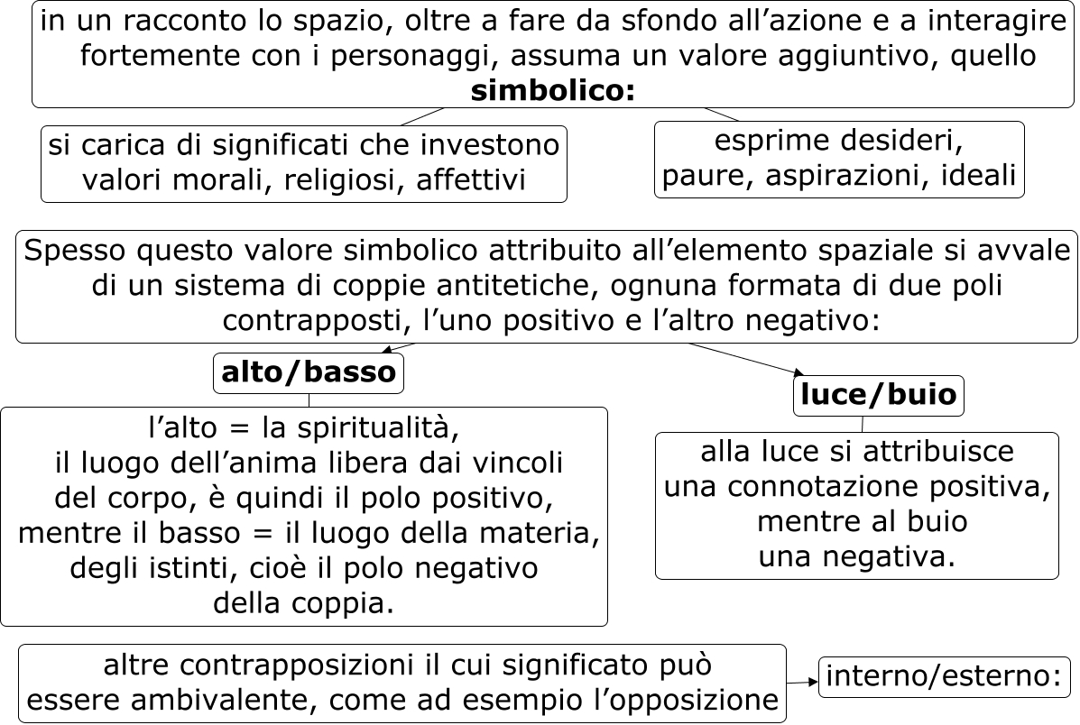 Questa Cmap, creata con IHMC CmapTools, contiene informazioni relative a: 71a lo spazio, altre contrapposizioni il cui significato può essere ambivalente, come ad esempio l’opposizione ???? interno/esterno:, in un racconto lo spazio, oltre a fare da sfondo all’azione e a interagire fortemente con i personaggi, assuma un valore aggiuntivo, quello simbolico: ???? si carica di significati che investono valori morali, religiosi, affettivi, luce/buio ???? alla luce si attribuisce una connotazione positiva, mentre al buio una negativa., alto/basso ???? l’alto = la spiritualità, il luogo dell’anima libera dai vincoli del corpo, è quindi il polo positivo, mentre il basso = il luogo della materia, degli istinti, cioè il polo negativo della coppia., Spesso questo valore simbolico attribuito all’elemento spaziale si avvale di un sistema di coppie antitetiche, ognuna formata di due poli contrapposti, l’uno positivo e l’altro negativo: ???? alto/basso, Spesso questo valore simbolico attribuito all’elemento spaziale si avvale di un sistema di coppie antitetiche, ognuna formata di due poli contrapposti, l’uno positivo e l’altro negativo: ???? luce/buio, in un racconto lo spazio, oltre a fare da sfondo all’azione e a interagire fortemente con i personaggi, assuma un valore aggiuntivo, quello simbolico: ???? esprime desideri, paure, aspirazioni, ideali