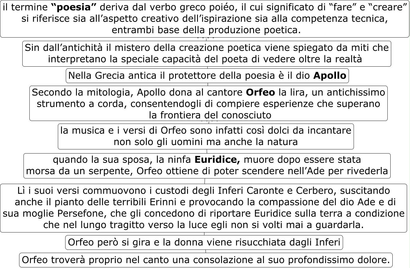 Questa Cmap, creata con IHMC CmapTools, contiene informazioni relative a: 84 poesia, quando la sua sposa, la ninfa Euridice, muore dopo essere stata morsa da un serpente, Orfeo ottiene di poter scendere nell’Ade per rivederla ???? Lì i suoi versi commuovono i custodi degli Inferi Caronte e Cerbero, suscitando anche il pianto delle terribili Erinni e provocando la compassione del dio Ade e di sua moglie Persefone, che gli concedono di riportare Euridice sulla terra a condizione che nel lungo tragitto verso la luce egli non si volti mai a guardarla., il termine “poesia�? deriva dal verbo greco poiéo, il cui significato di “fare�? e “creare�? si riferisce sia all’aspetto creativo dell’ispirazione sia alla competenza tecnica, entrambi base della produzione poetica. ???? Sin dall’antichità il mistero della creazione poetica viene spiegato da miti che interpretano la speciale capacità del poeta di vedere oltre la realtà, Lì i suoi versi commuovono i custodi degli Inferi Caronte e Cerbero, suscitando anche il pianto delle terribili Erinni e provocando la compassione del dio Ade e di sua moglie Persefone, che gli concedono di riportare Euridice sulla terra a condizione che nel lungo tragitto verso la luce egli non si volti mai a guardarla. ???? Orfeo però si gira e la donna viene risucchiata dagli Inferi, Sin dall’antichità il mistero della creazione poetica viene spiegato da miti che interpretano la speciale capacità del poeta di vedere oltre la realtà ???? Nella Grecia antica il protettore della poesia è il dio Apollo, Secondo la mitologia, Apollo dona al cantore Orfeo la lira, un antichissimo strumento a corda, consentendogli di compiere esperienze che superano la frontiera del conosciuto ???? la musica e i versi di Orfeo sono infatti così dolci da incantare non solo gli uomini ma anche la natura, Nella Grecia antica il protettore della poesia è il dio Apollo ???? Secondo la mitologia, Apollo dona al cantore Orfeo la lira, un antichissimo strumento a corda, consentendogli di compiere esperienze che superano la frontiera del conosciuto, Orfeo però si gira e la donna viene risucchiata dagli Inferi ???? Orfeo troverà proprio nel canto una consolazione al suo profondissimo dolore., la musica e i versi di Orfeo sono infatti così dolci da incantare non solo gli uomini ma anche la natura ???? quando la sua sposa, la ninfa Euridice, muore dopo essere stata morsa da un serpente, Orfeo ottiene di poter scendere nell’Ade per rivederla