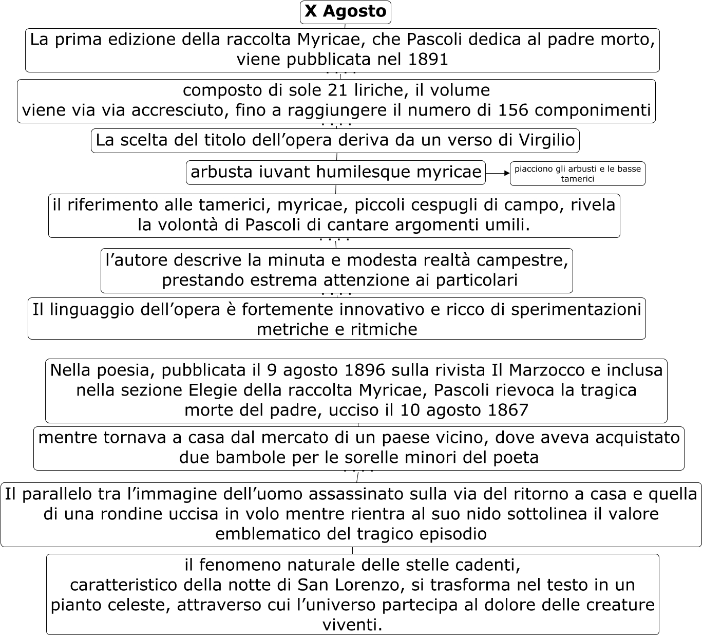 Questa Cmap, creata con IHMC CmapTools, contiene informazioni relative a: 141 pascoli, La prima edizione della raccolta Myricae, che Pascoli dedica al padre morto, viene pubblicata nel 1891 ???? composto di sole 21 liriche, il volume viene via via accresciuto, fino a raggiungere il numero di 156 componimenti, mentre tornava a casa dal mercato di un paese vicino, dove aveva acquistato due bambole per le sorelle minori del poeta ???? Il parallelo tra l’immagine dell’uomo assassinato sulla via del ritorno a casa e quella di una rondine uccisa in volo mentre rientra al suo nido sottolinea il valore emblematico del tragico episodio, composto di sole 21 liriche, il volume viene via via accresciuto, fino a raggiungere il numero di 156 componimenti ???? La scelta del titolo dell’opera deriva da un verso di Virgilio, il riferimento alle tamerici, myricae, piccoli cespugli di campo, rivela la volontà di Pascoli di cantare argomenti umili. ???? l’autore descrive la minuta e modesta realtà campestre, prestando estrema attenzione ai particolari, arbusta iuvant humilesque myricae ???? piacciono gli arbusti e le basse tamerici, La scelta del titolo dell’opera deriva da un verso di Virgilio ???? arbusta iuvant humilesque myricae, X Agosto ???? La prima edizione della raccolta Myricae, che Pascoli dedica al padre morto, viene pubblicata nel 1891, l’autore descrive la minuta e modesta realtà campestre, prestando estrema attenzione ai particolari ???? Il linguaggio dell’opera è fortemente innovativo e ricco di sperimentazioni metriche e ritmiche, arbusta iuvant humilesque myricae ???? il riferimento alle tamerici, myricae, piccoli cespugli di campo, rivela la volontà di Pascoli di cantare argomenti umili., Il parallelo tra l’immagine dell’uomo assassinato sulla via del ritorno a casa e quella di una rondine uccisa in volo mentre rientra al suo nido sottolinea il valore emblematico del tragico episodio ???? il fenomeno naturale delle stelle cadenti, caratteristico della notte di San Lorenzo, si trasforma nel testo in un pianto celeste, attraverso cui l’universo partecipa al dolore delle creature viventi., Nella poesia, pubblicata il 9 agosto 1896 sulla rivista Il Marzocco e inclusa nella sezione Elegie della raccolta Myricae, Pascoli rievoca la tragica morte del padre, ucciso il 10 agosto 1867 ???? mentre tornava a casa dal mercato di un paese vicino, dove aveva acquistato due bambole per le sorelle minori del poeta