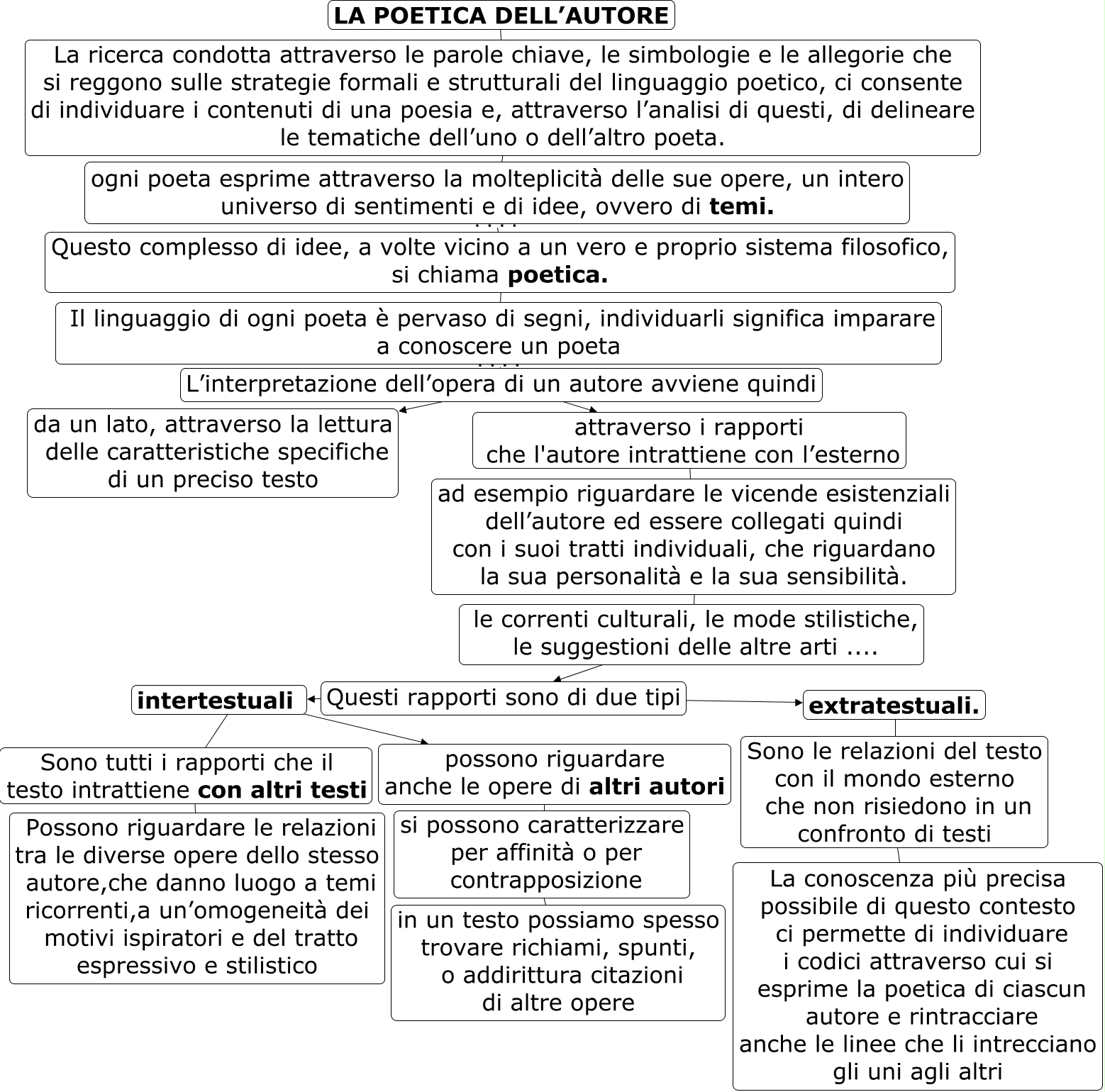 Questa Cmap, creata con IHMC CmapTools, contiene informazioni relative a: 70 poetica, Questi rapporti sono di due tipi ???? extratestuali., Questo complesso di idee, a volte vicino a un vero e proprio sistema filosofico, si chiama poetica. ???? Il linguaggio di ogni poeta è pervaso di segni, individuarli significa imparare a conoscere un poeta, si possono caratterizzare per affinità o per contrapposizione ???? in un testo possiamo spesso trovare richiami, spunti, o addirittura citazioni di altre opere, La ricerca condotta attraverso le parole chiave, le simbologie e le allegorie che si reggono sulle strategie formali e strutturali del linguaggio poetico, ci consente di individuare i contenuti di una poesia e, attraverso l’analisi di questi, di delineare le tematiche dell’uno o dell’altro poeta. ???? ogni poeta esprime attraverso la molteplicità delle sue opere, un intero universo di sentimenti e di idee, ovvero di temi., L’interpretazione dell’opera di un autore avviene quindi ???? da un lato, attraverso la lettura delle caratteristiche specifiche di un preciso testo, Il linguaggio di ogni poeta è pervaso di segni, individuarli significa imparare a conoscere un poeta ???? L’interpretazione dell’opera di un autore avviene quindi, intertestuali ???? Sono tutti i rapporti che il testo intrattiene con altri testi, ogni poeta esprime attraverso la molteplicità delle sue opere, un intero universo di sentimenti e di idee, ovvero di temi. ???? Questo complesso di idee, a volte vicino a un vero e proprio sistema filosofico, si chiama poetica., intertestuali ???? possono riguardare anche le opere di altri autori, le correnti culturali, le mode stilistiche, le suggestioni delle altre arti .... ???? Questi rapporti sono di due tipi, LA POETICA DELL’AUTORE ???? La ricerca condotta attraverso le parole chiave, le simbologie e le allegorie che si reggono sulle strategie formali e strutturali del linguaggio poetico, ci consente di individuare i contenuti di una poesia e, attraverso l’analisi di questi, di delineare le tematiche dell’uno o dell’altro poeta., possono riguardare anche le opere di altri autori ???? si possono caratterizzare per affinità o per contrapposizione, Questi rapporti sono di due tipi ???? intertestuali, L’interpretazione dell’opera di un autore avviene quindi ???? attraverso i rapporti che l'autore intrattiene con l’esterno, Sono le relazioni del testo con il mondo esterno che non risiedono in un confronto di testi ???? La conoscenza più precisa possibile di questo contesto ci permette di individuare i codici attraverso cui si esprime la poetica di ciascun autore e rintracciare anche le linee che li intrecciano gli uni agli altri, ad esempio riguardare le vicende esistenziali dell’autore ed essere collegati quindi con i suoi tratti individuali, che riguardano la sua personalità e la sua sensibilità. ???? le correnti culturali, le mode stilistiche, le suggestioni delle altre arti ...., extratestuali. ???? Sono le relazioni del testo con il mondo esterno che non risiedono in un confronto di testi, attraverso i rapporti che l'autore intrattiene con l’esterno ???? ad esempio riguardare le vicende esistenziali dell’autore ed essere collegati quindi con i suoi tratti individuali, che riguardano la sua personalità e la sua sensibilità., Sono tutti i rapporti che il testo intrattiene con altri testi ???? Possono riguardare le relazioni tra le diverse opere dello stesso autore,che danno luogo a temi ricorrenti,a un’omogeneità dei motivi ispiratori e del tratto espressivo e stilistico