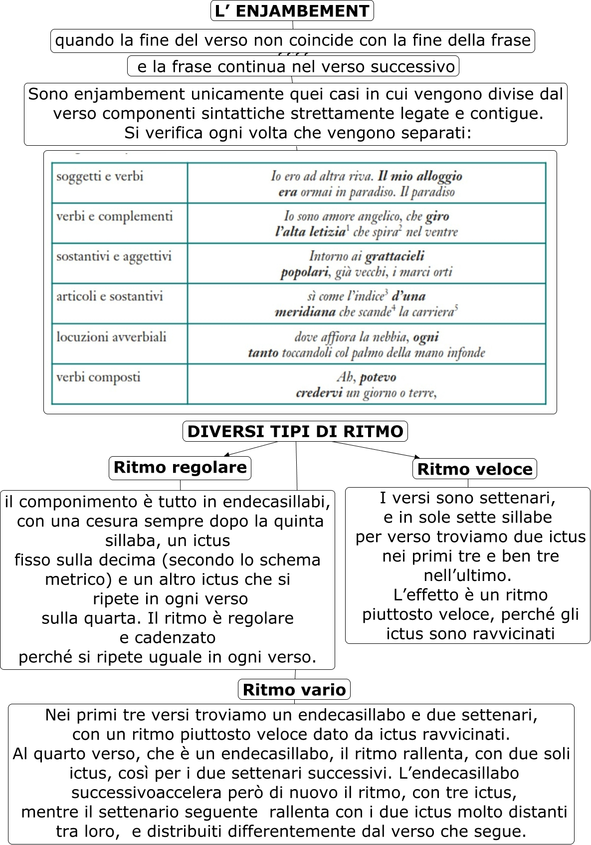 Questa Cmap, creata con IHMC CmapTools, contiene informazioni relative a: antologiaf.18, DIVERSI TIPI DI RITMO ???? Ritmo vario, quando la fine del verso non coincide con la fine della frase ???? e la frase continua nel verso successivo, Ritmo veloce ???? I versi sono settenari, e in sole sette sillabe per verso troviamo due ictus nei primi tre e ben tre nell’ultimo. L’effetto è un ritmo piuttosto veloce, perché gli ictus sono ravvicinati, Ritmo vario ???? Nei primi tre versi troviamo un endecasillabo e due settenari, con un ritmo piuttosto veloce dato da ictus ravvicinati. Al quarto verso, che è un endecasillabo, il ritmo rallenta, con due soli ictus, così per i due settenari successivi. L’endecasillabo successivoaccelera però di nuovo il ritmo, con tre ictus, mentre il settenario seguente rallenta con i due ictus molto distanti tra loro, e distribuiti differentemente dal verso che segue., e la frase continua nel verso successivo ???? Sono enjambement unicamente quei casi in cui vengono divise dal verso componenti sintattiche strettamente legate e contigue. Si verifica ogni volta che vengono separati:, L’ ENJAMBEMENT ???? quando la fine del verso non coincide con la fine della frase, Ritmo regolare ???? il componimento è tutto in endecasillabi, con una cesura sempre dopo la quinta sillaba, un ictus fisso sulla decima (secondo lo schema metrico) e un altro ictus che si ripete in ogni verso sulla quarta. Il ritmo è regolare e cadenzato perché si ripete uguale in ogni verso., DIVERSI TIPI DI RITMO ???? Ritmo regolare, Sono enjambement unicamente quei casi in cui vengono divise dal verso componenti sintattiche strettamente legate e contigue. Si verifica ogni volta che vengono separati: ????, DIVERSI TIPI DI RITMO ???? Ritmo veloce