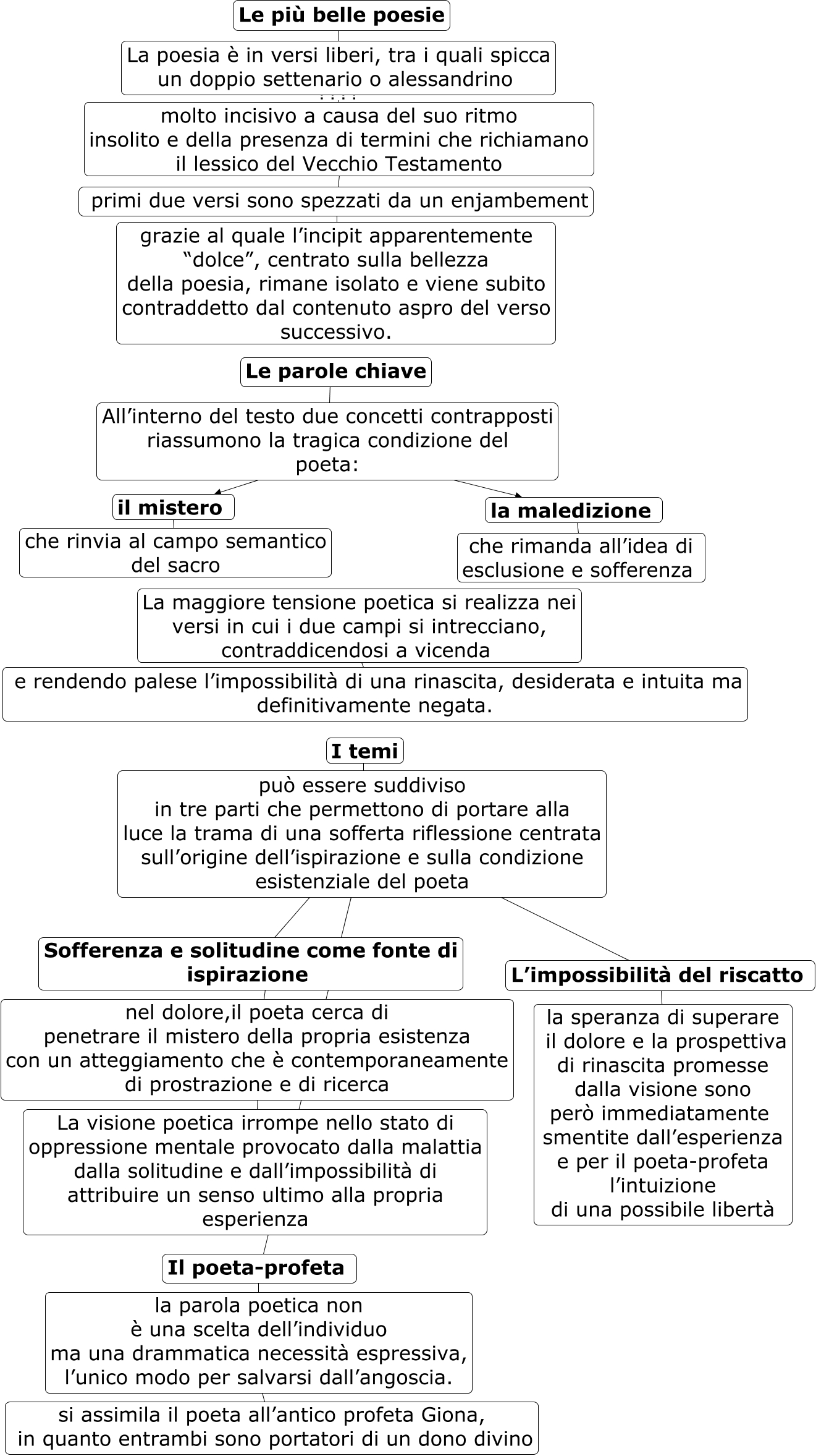 Questa Cmap, creata con IHMC CmapTools, contiene informazioni relative a: 95 ada merlini, Le parole chiave ???? All’interno del testo due concetti contrapposti riassumono la tragica condizione del poeta:, All’interno del testo due concetti contrapposti riassumono la tragica condizione del poeta: ???? il mistero, il mistero ???? che rinvia al campo semantico del sacro, primi due versi sono spezzati da un enjambement ???? grazie al quale l’incipit apparentemente “dolce�?, centrato sulla bellezza della poesia, rimane isolato e viene subito contraddetto dal contenuto aspro del verso successivo., Le più belle poesie ???? La poesia è in versi liberi, tra i quali spicca un doppio settenario o alessandrino, Sofferenza e solitudine come fonte di ispirazione ???? nel dolore,il poeta cerca di penetrare il mistero della propria esistenza con un atteggiamento che è contemporaneamente di prostrazione e di ricerca, I temi ???? può essere suddiviso in tre parti che permettono di portare alla luce la trama di una sofferta riflessione centrata sull’origine dell’ispirazione e sulla condizione esistenziale del poeta, la maledizione ???? che rimanda all’idea di esclusione e sofferenza, nel dolore,il poeta cerca di penetrare il mistero della propria esistenza con un atteggiamento che è contemporaneamente di prostrazione e di ricerca ???? La visione poetica irrompe nello stato di oppressione mentale provocato dalla malattia dalla solitudine e dall’impossibilità di attribuire un senso ultimo alla propria esperienza, può essere suddiviso in tre parti che permettono di portare alla luce la trama di una sofferta riflessione centrata sull’origine dell’ispirazione e sulla condizione esistenziale del poeta ???? L’impossibilità del riscatto, Il poeta-profeta ???? la parola poetica non è una scelta dell’individuo ma una drammatica necessità espressiva, l’unico modo per salvarsi dall’angoscia., All’interno del testo due concetti contrapposti riassumono la tragica condizione del poeta: ???? la maledizione, può essere suddiviso in tre parti che permettono di portare alla luce la trama di una sofferta riflessione centrata sull’origine dell’ispirazione e sulla condizione esistenziale del poeta ???? Sofferenza e solitudine come fonte di ispirazione, molto incisivo a causa del suo ritmo insolito e della presenza di termini che richiamano il lessico del Vecchio Testamento ???? primi due versi sono spezzati da un enjambement, La poesia è in versi liberi, tra i quali spicca un doppio settenario o alessandrino ???? molto incisivo a causa del suo ritmo insolito e della presenza di termini che richiamano il lessico del Vecchio Testamento, L’impossibilità del riscatto ???? la speranza di superare il dolore e la prospettiva di rinascita promesse dalla visione sono però immediatamente smentite dall’esperienza e per il poeta-profeta l’intuizione di una possibile libertà, la parola poetica non è una scelta dell’individuo ma una drammatica necessità espressiva, l’unico modo per salvarsi dall’angoscia. ???? si assimila il poeta all’antico profeta Giona, in quanto entrambi sono portatori di un dono divino, La maggiore tensione poetica si realizza nei versi in cui i due campi si intrecciano, contraddicendosi a vicenda ???? e rendendo palese l’impossibilità di una rinascita, desiderata e intuita ma definitivamente negata., può essere suddiviso in tre parti che permettono di portare alla luce la trama di una sofferta riflessione centrata sull’origine dell’ispirazione e sulla condizione esistenziale del poeta ???? Il poeta-profeta