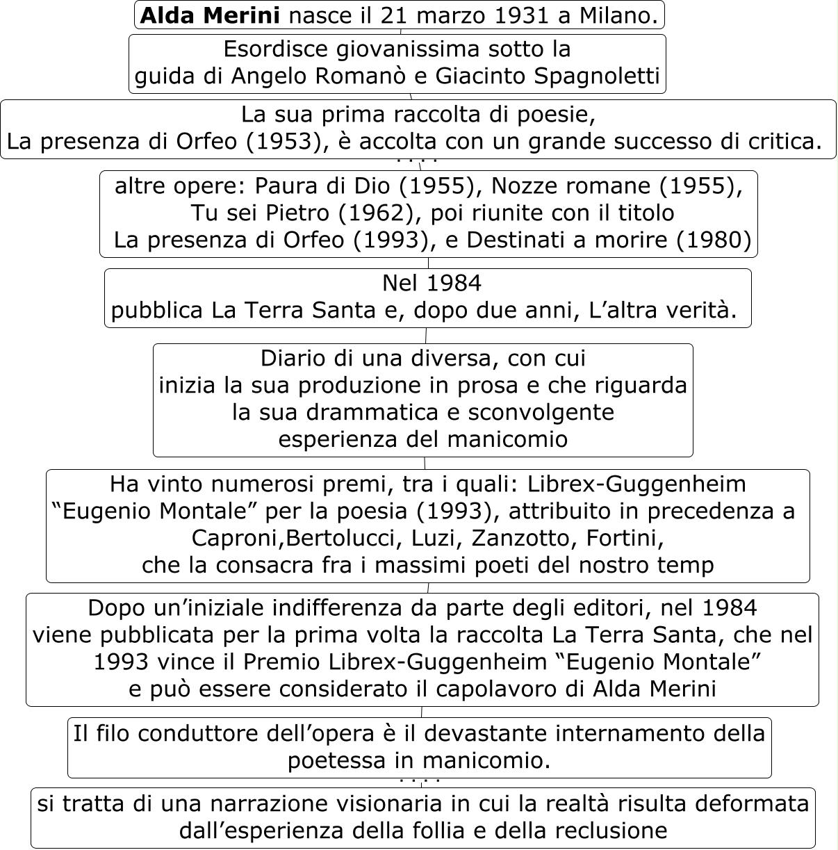Questa Cmap, creata con IHMC CmapTools, contiene informazioni relative a: 94 ada merlini, Esordisce giovanissima sotto la guida di Angelo Romanò e Giacinto Spagnoletti ???? La sua prima raccolta di poesie, La presenza di Orfeo (1953), è accolta con un grande successo di critica., Dopo un’iniziale indifferenza da parte degli editori, nel 1984 viene pubblicata per la prima volta la raccolta La Terra Santa, che nel 1993 vince il Premio Librex-Guggenheim “Eugenio Montale�? e può essere considerato il capolavoro di Alda Merini ???? Il filo conduttore dell’opera è il devastante internamento della poetessa in manicomio., Diario di una diversa, con cui inizia la sua produzione in prosa e che riguarda la sua drammatica e sconvolgente esperienza del manicomio ???? Ha vinto numerosi premi, tra i quali: Librex-Guggenheim “Eugenio Montale�? per la poesia (1993), attribuito in precedenza a Caproni,Bertolucci, Luzi, Zanzotto, Fortini, che la consacra fra i massimi poeti del nostro temp, Alda Merini nasce il 21 marzo 1931 a Milano. ???? Esordisce giovanissima sotto la guida di Angelo Romanò e Giacinto Spagnoletti, La sua prima raccolta di poesie, La presenza di Orfeo (1953), è accolta con un grande successo di critica. ???? altre opere: Paura di Dio (1955), Nozze romane (1955), Tu sei Pietro (1962), poi riunite con il titolo La presenza di Orfeo (1993), e Destinati a morire (1980), Ha vinto numerosi premi, tra i quali: Librex-Guggenheim “Eugenio Montale�? per la poesia (1993), attribuito in precedenza a Caproni,Bertolucci, Luzi, Zanzotto, Fortini, che la consacra fra i massimi poeti del nostro temp ???? Dopo un’iniziale indifferenza da parte degli editori, nel 1984 viene pubblicata per la prima volta la raccolta La Terra Santa, che nel 1993 vince il Premio Librex-Guggenheim “Eugenio Montale�? e può essere considerato il capolavoro di Alda Merini, Nel 1984 pubblica La Terra Santa e, dopo due anni, L’altra verità. ???? Diario di una diversa, con cui inizia la sua produzione in prosa e che riguarda la sua drammatica e sconvolgente esperienza del manicomio, altre opere: Paura di Dio (1955), Nozze romane (1955), Tu sei Pietro (1962), poi riunite con il titolo La presenza di Orfeo (1993), e Destinati a morire (1980) ???? Nel 1984 pubblica La Terra Santa e, dopo due anni, L’altra verità., Il filo conduttore dell’opera è il devastante internamento della poetessa in manicomio. ???? si tratta di una narrazione visionaria in cui la realtà risulta deformata dall’esperienza della follia e della reclusione