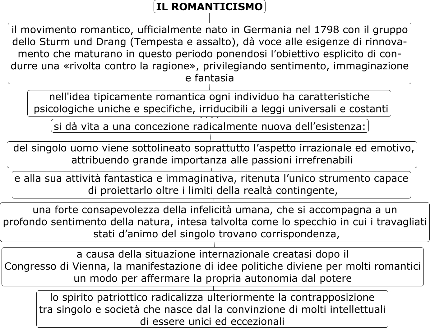 Questa Cmap, creata con IHMC CmapTools, contiene informazioni relative a: 117 romanticismo, nell'idea tipicamente romantica ogni individuo ha caratteristiche psicologiche uniche e specifiche, irriducibili a leggi universali e costanti ???? si dà vita a una concezione radicalmente nuova dell’esistenza:, IL ROMANTICISMO ???? il movimento romantico, ufficialmente nato in Germania nel 1798 con il gruppo dello Sturm und Drang (Tempesta e assalto), dà voce alle esigenze di rinnova- mento che maturano in questo periodo ponendosi l’obiettivo esplicito di con- durre una «rivolta contro la ragione», privilegiando sentimento, immaginazione e fantasia, e alla sua attività fantastica e immaginativa, ritenuta l’unico strumento capace di proiettarlo oltre i limiti della realtà contingente, ???? una forte consapevolezza della infelicità umana, che si accompagna a un profondo sentimento della natura, intesa talvolta come lo specchio in cui i travagliati stati d’animo del singolo trovano corrispondenza,, a causa della situazione internazionale creatasi dopo il Congresso di Vienna, la manifestazione di idee politiche diviene per molti romantici un modo per affermare la propria autonomia dal potere ???? lo spirito patriottico radicalizza ulteriormente la contrapposizione tra singolo e società che nasce dal la convinzione di molti intellettuali di essere unici ed eccezionali, si dà vita a una concezione radicalmente nuova dell’esistenza: ???? del singolo uomo viene sottolineato soprattutto l’aspetto irrazionale ed emotivo, attribuendo grande importanza alle passioni irrefrenabili, una forte consapevolezza della infelicità umana, che si accompagna a un profondo sentimento della natura, intesa talvolta come lo specchio in cui i travagliati stati d’animo del singolo trovano corrispondenza, ???? a causa della situazione internazionale creatasi dopo il Congresso di Vienna, la manifestazione di idee politiche diviene per molti romantici un modo per affermare la propria autonomia dal potere, del singolo uomo viene sottolineato soprattutto l’aspetto irrazionale ed emotivo, attribuendo grande importanza alle passioni irrefrenabili ???? e alla sua attività fantastica e immaginativa, ritenuta l’unico strumento capace di proiettarlo oltre i limiti della realtà contingente,, il movimento romantico, ufficialmente nato in Germania nel 1798 con il gruppo dello Sturm und Drang (Tempesta e assalto), dà voce alle esigenze di rinnova- mento che maturano in questo periodo ponendosi l’obiettivo esplicito di con- durre una «rivolta contro la ragione», privilegiando sentimento, immaginazione e fantasia ???? nell'idea tipicamente romantica ogni individuo ha caratteristiche psicologiche uniche e specifiche, irriducibili a leggi universali e costanti