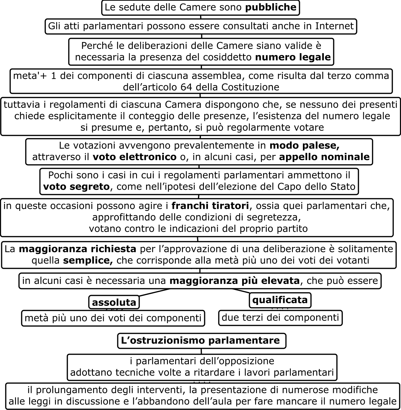 Questa Cmap, creata con IHMC CmapTools, contiene informazioni relative a: parlamento p.43a, tuttavia i regolamenti di ciascuna Camera dispongono che, se nessuno dei presenti chiede esplicitamente il conteggio delle presenze, l’esistenza del numero legale si presume e, pertanto, si può regolarmente votare ???? Le votazioni avvengono prevalentemente in modo palese, attraverso il voto elettronico o, in alcuni casi, per appello nominale, in alcuni casi è necessaria una maggioranza più elevata, che può essere ???? qualificata, La maggioranza richiesta per l’approvazione di una deliberazione è solitamente quella semplice, che corrisponde alla metà più uno dei voti dei votanti ???? in alcuni casi è necessaria una maggioranza più elevata, che può essere, Le sedute delle Camere sono pubbliche ???? Gli atti parlamentari possono essere consultati anche in Internet, meta'+ 1 dei componenti di ciascuna assemblea, come risulta dal terzo comma dell’articolo 64 della Costituzione ???? tuttavia i regolamenti di ciascuna Camera dispongono che, se nessuno dei presenti chiede esplicitamente il conteggio delle presenze, l’esistenza del numero legale si presume e, pertanto, si può regolarmente votare, assoluta ???? metà più uno dei voti dei componenti, Gli atti parlamentari possono essere consultati anche in Internet ???? Perché le deliberazioni delle Camere siano valide è necessaria la presenza del cosiddetto numero legale, i parlamentari dell’opposizione adottano tecniche volte a ritardare i lavori parlamentari ???? il prolungamento degli interventi, la presentazione di numerose modifiche alle leggi in discussione e l’abbandono dell’aula per fare mancare il numero legale, Le votazioni avvengono prevalentemente in modo palese, attraverso il voto elettronico o, in alcuni casi, per appello nominale ???? Pochi sono i casi in cui i regolamenti parlamentari ammettono il voto segreto, come nell’ipotesi dell’elezione del Capo dello Stato, Pochi sono i casi in cui i regolamenti parlamentari ammettono il voto segreto, come nell’ipotesi dell’elezione del Capo dello Stato ???? in queste occasioni possono agire i franchi tiratori, ossia quei parlamentari che, approfittando delle condizioni di segretezza, votano contro le indicazioni del proprio partito, in queste occasioni possono agire i franchi tiratori, ossia quei parlamentari che, approfittando delle condizioni di segretezza, votano contro le indicazioni del proprio partito ???? La maggioranza richiesta per l’approvazione di una deliberazione è solitamente quella semplice, che corrisponde alla metà più uno dei voti dei votanti, L’ostruzionismo parlamentare ???? i parlamentari dell’opposizione adottano tecniche volte a ritardare i lavori parlamentari, qualificata ???? due terzi dei componenti, in alcuni casi è necessaria una maggioranza più elevata, che può essere ???? assoluta, Perché le deliberazioni delle Camere siano valide è necessaria la presenza del cosiddetto numero legale ???? meta'+ 1 dei componenti di ciascuna assemblea, come risulta dal terzo comma dell’articolo 64 della Costituzione