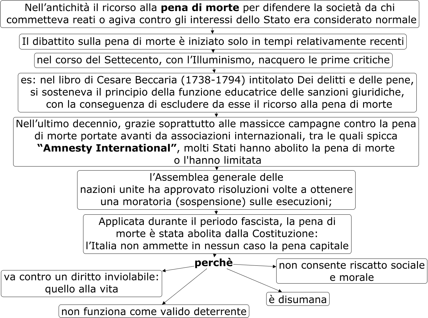 Questa Cmap, creata con IHMC CmapTools, contiene informazioni relative a: organizz. internazionali p.119, l’Assemblea generale delle nazioni unite ha approvato risoluzioni volte a ottenere una moratoria (sospensione) sulle esecuzioni; ???? Applicata durante il periodo fascista, la pena di morte è stata abolita dalla Costituzione: l’Italia non ammette in nessun caso la pena capitale, Nell’ultimo decennio, grazie soprattutto alle massicce campagne contro la pena di morte portate avanti da associazioni internazionali, tra le quali spicca “Amnesty International�?, molti Stati hanno abolito la pena di morte o l'hanno limitata ???? l’Assemblea generale delle nazioni unite ha approvato risoluzioni volte a ottenere una moratoria (sospensione) sulle esecuzioni;, Il dibattito sulla pena di morte è iniziato solo in tempi relativamente recenti ???? nel corso del Settecento, con l’Illuminismo, nacquero le prime critiche, Applicata durante il periodo fascista, la pena di morte è stata abolita dalla Costituzione: l’Italia non ammette in nessun caso la pena capitale perchè non funziona come valido deterrente, es: nel libro di Cesare Beccaria (1738-1794) intitolato Dei delitti e delle pene, si sosteneva il principio della funzione educatrice delle sanzioni giuridiche, con la conseguenza di escludere da esse il ricorso alla pena di morte ???? Nell’ultimo decennio, grazie soprattutto alle massicce campagne contro la pena di morte portate avanti da associazioni internazionali, tra le quali spicca “Amnesty International�?, molti Stati hanno abolito la pena di morte o l'hanno limitata, Applicata durante il periodo fascista, la pena di morte è stata abolita dalla Costituzione: l’Italia non ammette in nessun caso la pena capitale perchè è disumana, Applicata durante il periodo fascista, la pena di morte è stata abolita dalla Costituzione: l’Italia non ammette in nessun caso la pena capitale perchè va contro un diritto inviolabile: quello alla vita, Nell’antichità il ricorso alla pena di morte per difendere la società da chi commetteva reati o agiva contro gli interessi dello Stato era considerato normale ???? Il dibattito sulla pena di morte è iniziato solo in tempi relativamente recenti, Applicata durante il periodo fascista, la pena di morte è stata abolita dalla Costituzione: l’Italia non ammette in nessun caso la pena capitale perchè non consente riscatto sociale e morale, nel corso del Settecento, con l’Illuminismo, nacquero le prime critiche ???? es: nel libro di Cesare Beccaria (1738-1794) intitolato Dei delitti e delle pene, si sosteneva il principio della funzione educatrice delle sanzioni giuridiche, con la conseguenza di escludere da esse il ricorso alla pena di morte