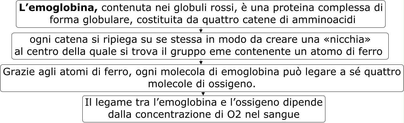 Questa Cmap, creata con IHMC CmapTools, contiene informazioni relative a: p.154 cellule staminali, L’emoglobina, contenuta nei globuli rossi, è una proteina complessa di forma globulare, costituita da quattro catene di amminoacidi ???? ogni catena si ripiega su se stessa in modo da creare una «nicchia» al centro della quale si trova il gruppo eme contenente un atomo di ferro, Grazie agli atomi di ferro, ogni molecola di emoglobina può legare a sé quattro molecole di ossigeno. ???? Il legame tra l’emoglobina e l’ossigeno dipende dalla concentrazione di O2 nel sangue, ogni catena si ripiega su se stessa in modo da creare una «nicchia» al centro della quale si trova il gruppo eme contenente un atomo di ferro ???? Grazie agli atomi di ferro, ogni molecola di emoglobina può legare a sé quattro molecole di ossigeno.