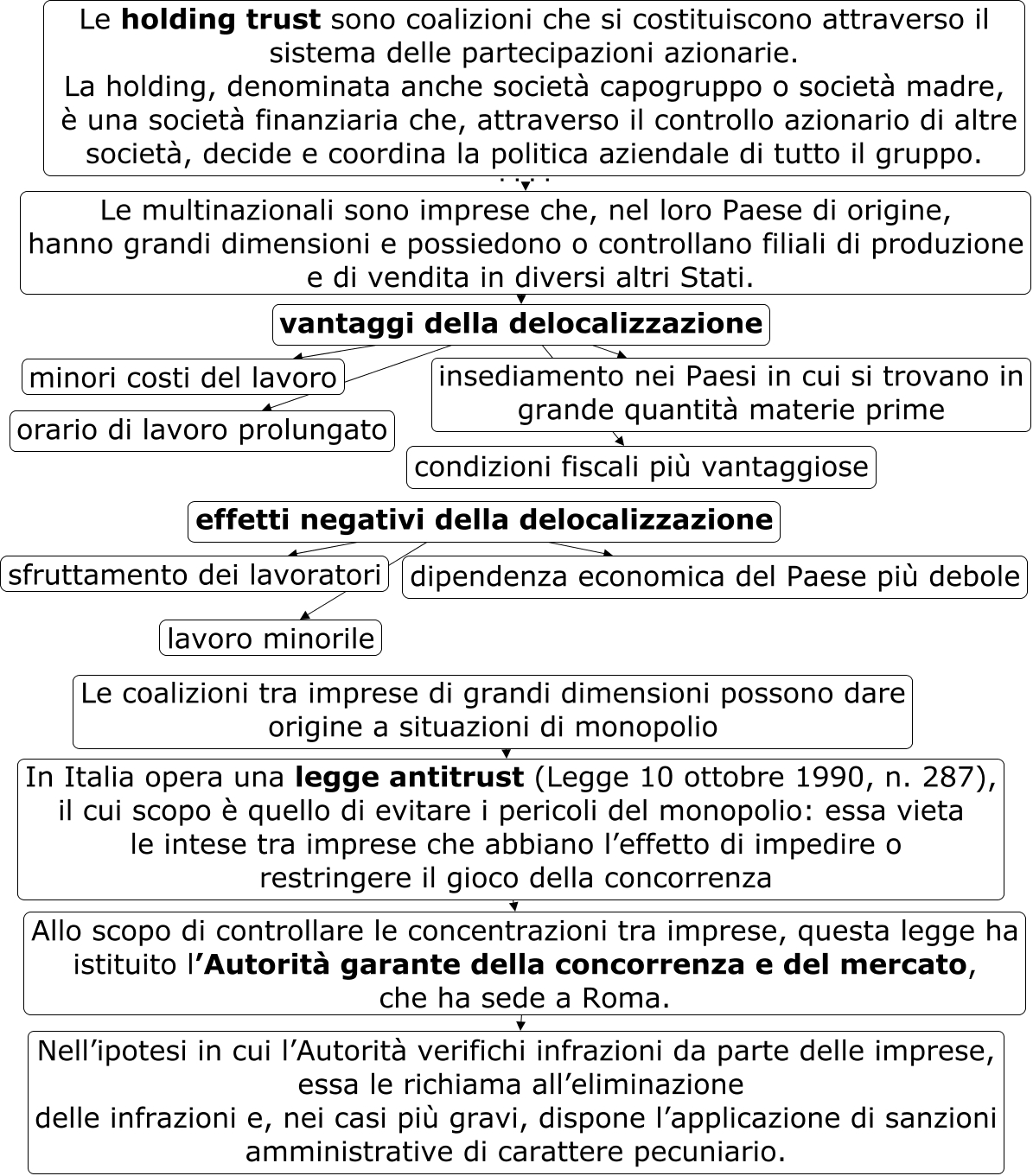 Questa Cmap, creata con IHMC CmapTools, contiene informazioni relative a: mercati 6, Le coalizioni tra imprese di grandi dimensioni possono dare origine a situazioni di monopolio ???? In Italia opera una legge antitrust (Legge 10 ottobre 1990, n. 287), il cui scopo è quello di evitare i pericoli del monopolio: essa vieta le intese tra imprese che abbiano l’effetto di impedire o restringere il gioco della concorrenza, effetti negativi della delocalizzazione ???? sfruttamento dei lavoratori, Le multinazionali sono imprese che, nel loro Paese di origine, hanno grandi dimensioni e possiedono o controllano filiali di produzione e di vendita in diversi altri Stati. ???? vantaggi della delocalizzazione, In Italia opera una legge antitrust (Legge 10 ottobre 1990, n. 287), il cui scopo è quello di evitare i pericoli del monopolio: essa vieta le intese tra imprese che abbiano l’effetto di impedire o restringere il gioco della concorrenza ???? Allo scopo di controllare le concentrazioni tra imprese, questa legge ha istituito l’Autorità garante della concorrenza e del mercato, che ha sede a Roma., Le holding trust sono coalizioni che si costituiscono attraverso il sistema delle partecipazioni azionarie. La holding, denominata anche società capogruppo o società madre, è una società finanziaria che, attraverso il controllo azionario di altre società, decide e coordina la politica aziendale di tutto il gruppo. ???? Le multinazionali sono imprese che, nel loro Paese di origine, hanno grandi dimensioni e possiedono o controllano filiali di produzione e di vendita in diversi altri Stati., vantaggi della delocalizzazione . minori costi del lavoro, vantaggi della delocalizzazione . insediamento nei Paesi in cui si trovano in grande quantità materie prime, vantaggi della delocalizzazione . condizioni fiscali più vantaggiose, effetti negativi della delocalizzazione ???? dipendenza economica del Paese più debole, effetti negativi della delocalizzazione ???? lavoro minorile, Allo scopo di controllare le concentrazioni tra imprese, questa legge ha istituito l’Autorità garante della concorrenza e del mercato, che ha sede a Roma. ???? Nell’ipotesi in cui l’Autorità verifichi infrazioni da parte delle imprese, essa le richiama all’eliminazione delle infrazioni e, nei casi più gravi, dispone l’applicazione di sanzioni amministrative di carattere pecuniario., vantaggi della delocalizzazione . orario di lavoro prolungato