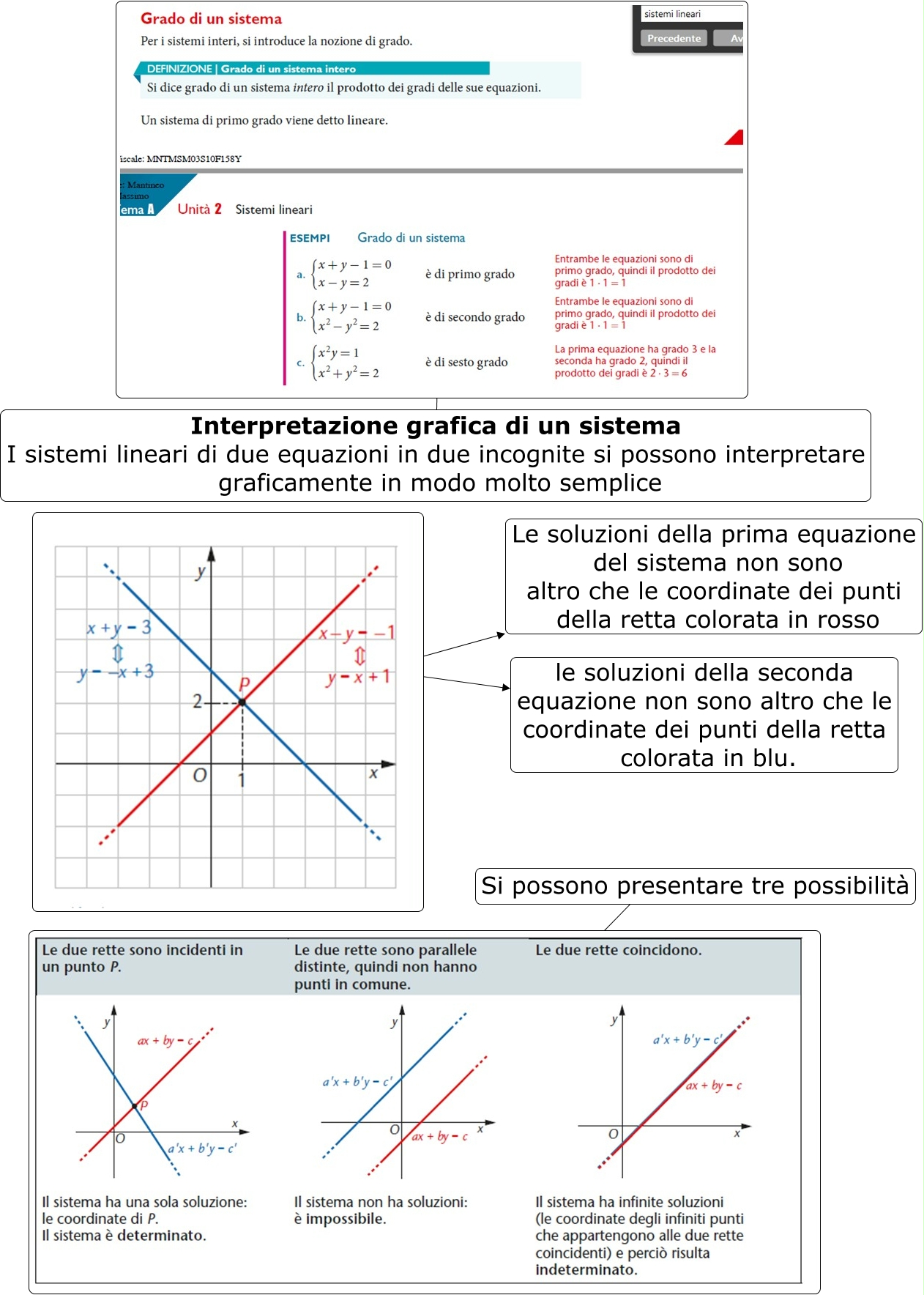 Questa Cmap, creata con IHMC CmapTools, contiene informazioni relative a: sistemi lineari p.70, ???? Le soluzioni della prima equazione del sistema non sono altro che le coordinate dei punti della retta colorata in rosso, ???? Interpretazione grafica di un sistema I sistemi lineari di due equazioni in due incognite si possono interpretare graficamente in modo molto semplice, Si possono presentare tre possibilità ????, ???? le soluzioni della seconda equazione non sono altro che le coordinate dei punti della retta colorata in blu.