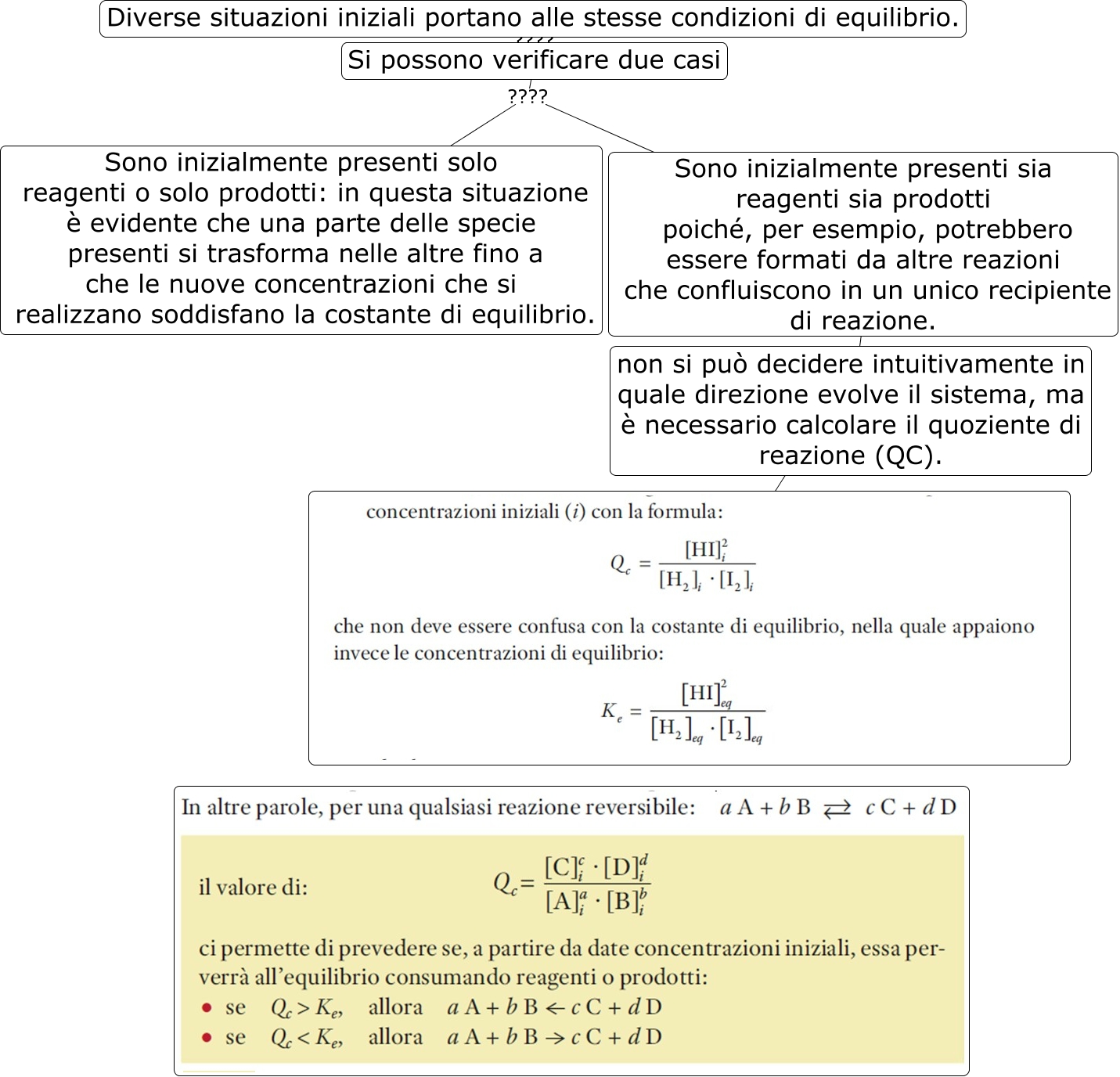 Questa Cmap, creata con IHMC CmapTools, contiene informazioni relative a: p.285 cinetica, Si possono verificare due casi ???? Sono inizialmente presenti sia reagenti sia prodotti poiché, per esempio, potrebbero essere formati da altre reazioni che confluiscono in un unico recipiente di reazione., Si possono verificare due casi ???? Sono inizialmente presenti solo reagenti o solo prodotti: in questa situazione è evidente che una parte delle specie presenti si trasforma nelle altre fino a che le nuove concentrazioni che si realizzano soddisfano la costante di equilibrio., Diverse situazioni iniziali portano alle stesse condizioni di equilibrio. ???? Si possono verificare due casi, non si può decidere intuitivamente in quale direzione evolve il sistema, ma è necessario calcolare il quoziente di reazione (QC). ????, Sono inizialmente presenti sia reagenti sia prodotti poiché, per esempio, potrebbero essere formati da altre reazioni che confluiscono in un unico recipiente di reazione. ???? non si può decidere intuitivamente in quale direzione evolve il sistema, ma è necessario calcolare il quoziente di reazione (QC).