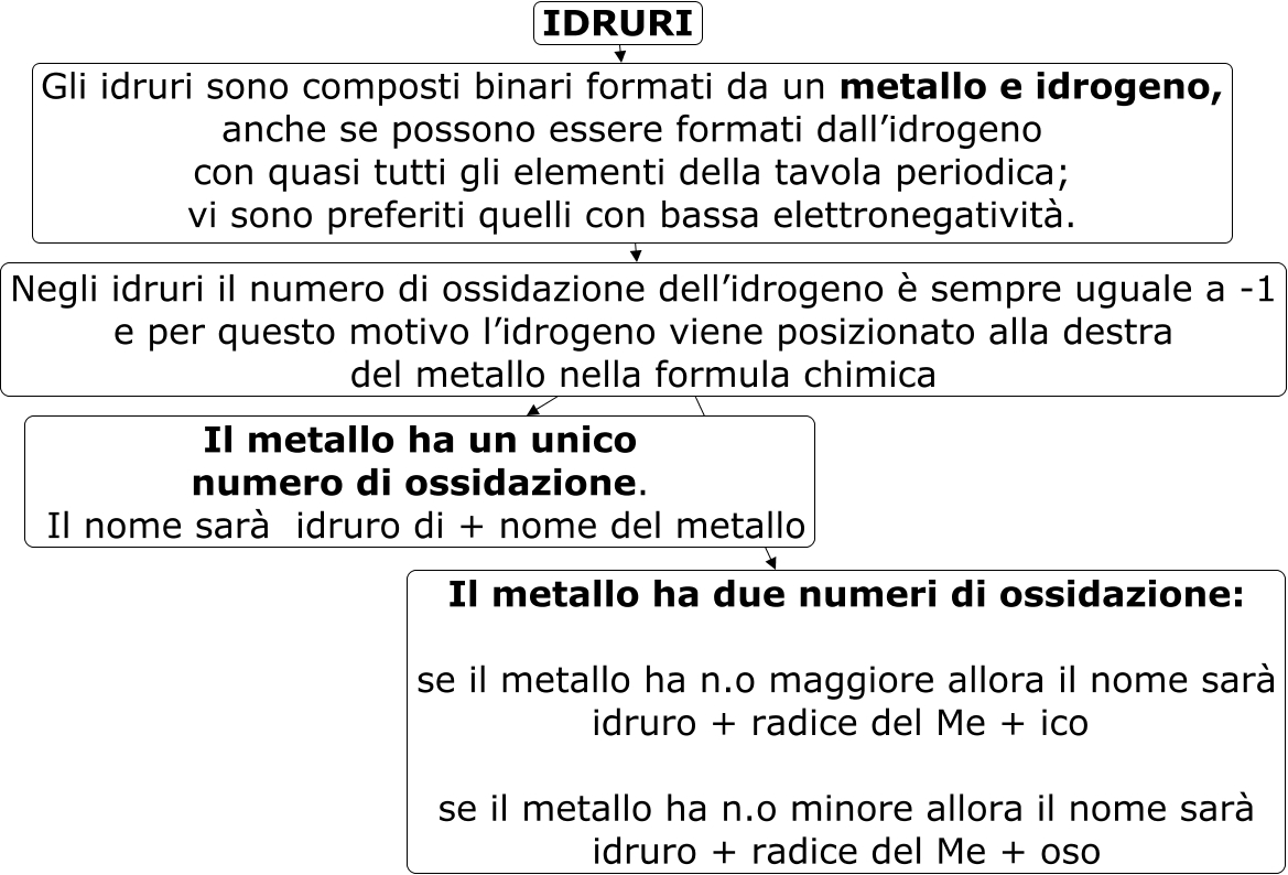 Questa Cmap, creata con IHMC CmapTools, contiene informazioni relative a: IDRURI, Negli idruri il numero di ossidazione dell’idrogeno è sempre uguale a -1 e per questo motivo l’idrogeno viene posizionato alla destra del metallo nella formula chimica ???? Il metallo ha due numeri di ossidazione: se il metallo ha n.o maggiore allora il nome sarà idruro + radice del Me + ico se il metallo ha n.o minore allora il nome sarà idruro + radice del Me + oso, IDRURI ???? Gli idruri sono composti binari formati da un metallo e idrogeno, anche se possono essere formati dall’idrogeno con quasi tutti gli elementi della tavola periodica; vi sono preferiti quelli con bassa elettronegatività., Negli idruri il numero di ossidazione dell’idrogeno è sempre uguale a -1 e per questo motivo l’idrogeno viene posizionato alla destra del metallo nella formula chimica ???? Il metallo ha un unico numero di ossidazione. Il nome sarà idruro di + nome del metallo, Gli idruri sono composti binari formati da un metallo e idrogeno, anche se possono essere formati dall’idrogeno con quasi tutti gli elementi della tavola periodica; vi sono preferiti quelli con bassa elettronegatività. ???? Negli idruri il numero di ossidazione dell’idrogeno è sempre uguale a -1 e per questo motivo l’idrogeno viene posizionato alla destra del metallo nella formula chimica