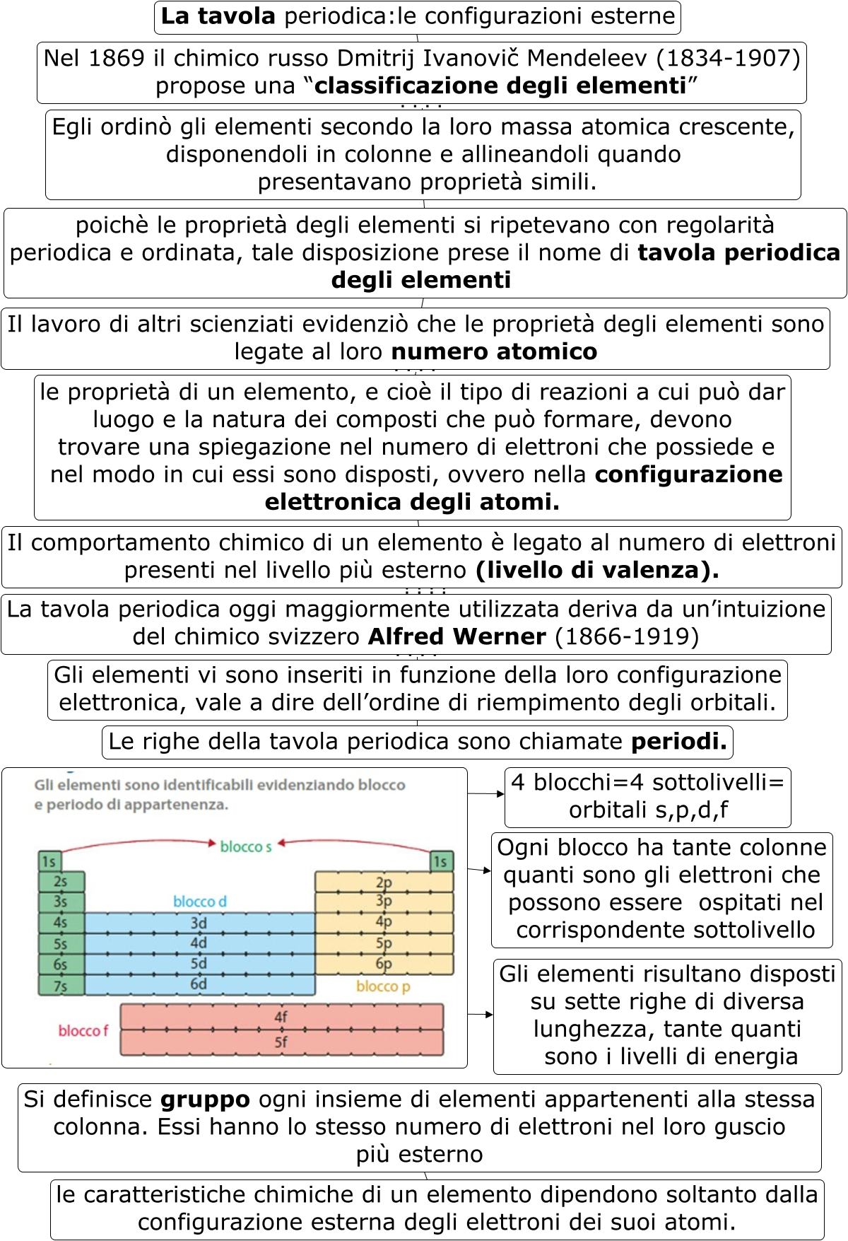 Questa Cmap, creata con IHMC CmapTools, contiene informazioni relative a: tavola periodicaf.167, Il comportamento chimico di un elemento è legato al numero di elettroni presenti nel livello più esterno (livello di valenza). ???? La tavola periodica oggi maggiormente utilizzata deriva da un’intuizione del chimico svizzero Alfred Werner (1866-1919), Gli elementi vi sono inseriti in funzione della loro configurazione elettronica, vale a dire dell’ordine di riempimento degli orbitali. ???? Le righe della tavola periodica sono chiamate periodi., Il lavoro di altri scienziati evidenziò che le proprietà degli elementi sono legate al loro numero atomico ???? le proprietà di un elemento, e cioè il tipo di reazioni a cui può dar luogo e la natura dei composti che può formare, devono trovare una spiegazione nel numero di elettroni che possiede e nel modo in cui essi sono disposti, ovvero nella configurazione elettronica degli atomi., poichè le proprietà degli elementi si ripetevano con regolarità periodica e ordinata, tale disposizione prese il nome di tavola periodica degli elementi ???? Il lavoro di altri scienziati evidenziò che le proprietà degli elementi sono legate al loro numero atomico, le proprietà di un elemento, e cioè il tipo di reazioni a cui può dar luogo e la natura dei composti che può formare, devono trovare una spiegazione nel numero di elettroni che possiede e nel modo in cui essi sono disposti, ovvero nella configurazione elettronica degli atomi. ???? Il comportamento chimico di un elemento è legato al numero di elettroni presenti nel livello più esterno (livello di valenza)., La tavola periodica oggi maggiormente utilizzata deriva da un’intuizione del chimico svizzero Alfred Werner (1866-1919) ???? Gli elementi vi sono inseriti in funzione della loro configurazione elettronica, vale a dire dell’ordine di riempimento degli orbitali., ???? Ogni blocco ha tante colonne quanti sono gli elettroni che possono essere ospitati nel corrispondente sottolivello, La tavola periodica:le configurazioni esterne ???? Nel 1869 il chimico russo Dmitrij Ivanovi�? Mendeleev (1834-1907) propose una “classificazione degli elementi�?, ???? Gli elementi risultano disposti su sette righe di diversa lunghezza, tante quanti sono i livelli di energia, Si definisce gruppo ogni insieme di elementi appartenenti alla stessa colonna. Essi hanno lo stesso numero di elettroni nel loro guscio più esterno ???? le caratteristiche chimiche di un elemento dipendono soltanto dalla configurazione esterna degli elettroni dei suoi atomi., ???? 4 blocchi=4 sottolivelli= orbitali s,p,d,f, Egli ordinò gli elementi secondo la loro massa atomica crescente, disponendoli in colonne e allineandoli quando presentavano proprietà simili. ???? poichè le proprietà degli elementi si ripetevano con regolarità periodica e ordinata, tale disposizione prese il nome di tavola periodica degli elementi, Nel 1869 il chimico russo Dmitrij Ivanovi�? Mendeleev (1834-1907) propose una “classificazione degli elementi�? ???? Egli ordinò gli elementi secondo la loro massa atomica crescente, disponendoli in colonne e allineandoli quando presentavano proprietà simili.