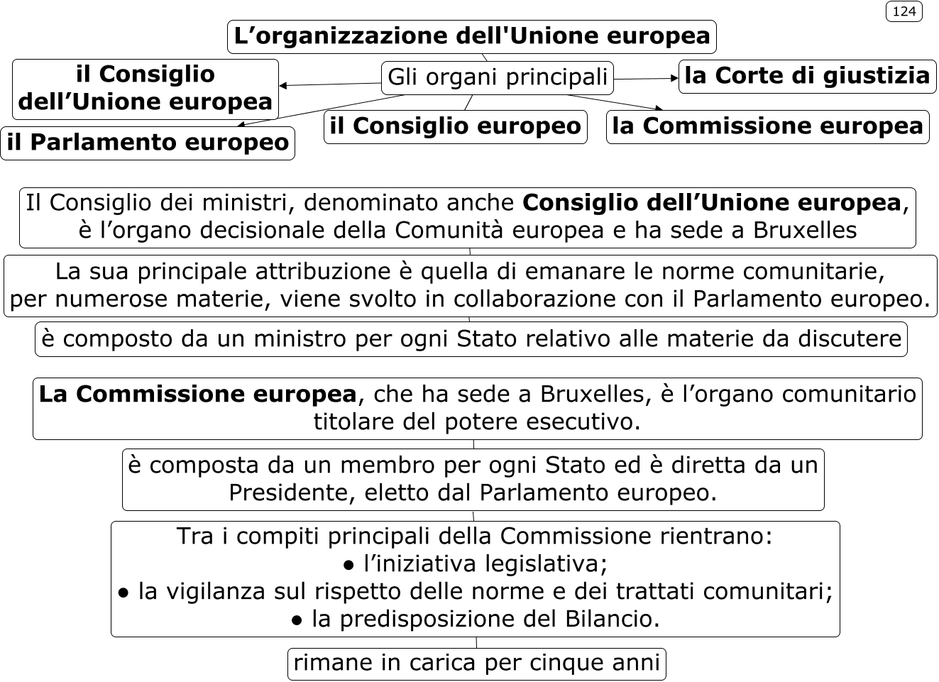 Questa Cmap, creata con IHMC CmapTools, contiene informazioni relative a: unione europea 125, Il Consiglio dei ministri, denominato anche Consiglio dell’Unione europea, è l’organo decisionale della Comunità europea e ha sede a Bruxelles ???? La sua principale attribuzione è quella di emanare le norme comunitarie, per numerose materie, viene svolto in collaborazione con il Parlamento europeo., Gli organi principali ???? la Corte di giustizia, è composta da un membro per ogni Stato ed è diretta da un Presidente, eletto dal Parlamento europeo. ???? Tra i compiti principali della Commissione rientrano: �? l’iniziativa legislativa; �? la vigilanza sul rispetto delle norme e dei trattati comunitari; �? la predisposizione del Bilancio., Gli organi principali ???? la Commissione europea, Gli organi principali ???? il Consiglio dell’Unione europea, Gli organi principali ???? il Consiglio europeo, La Commissione europea, che ha sede a Bruxelles, è l’organo comunitario titolare del potere esecutivo. ???? è composta da un membro per ogni Stato ed è diretta da un Presidente, eletto dal Parlamento europeo., L’organizzazione dell'Unione europea ???? Gli organi principali, Tra i compiti principali della Commissione rientrano: �? l’iniziativa legislativa; �? la vigilanza sul rispetto delle norme e dei trattati comunitari; �? la predisposizione del Bilancio. ???? rimane in carica per cinque anni, La sua principale attribuzione è quella di emanare le norme comunitarie, per numerose materie, viene svolto in collaborazione con il Parlamento europeo. ???? è composto da un ministro per ogni Stato relativo alle materie da discutere, Gli organi principali ???? il Parlamento europeo