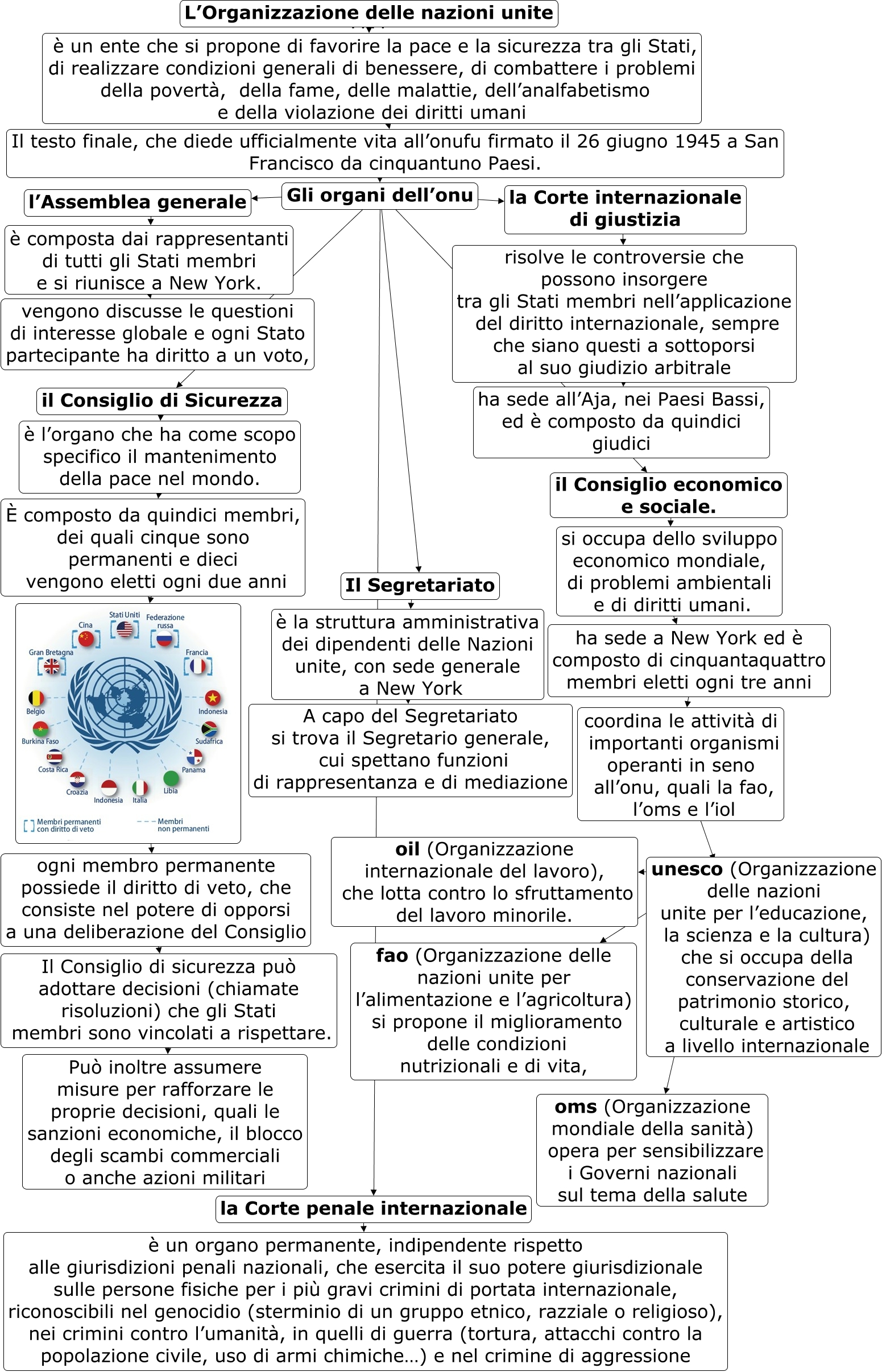Questa Cmap, creata con IHMC CmapTools, contiene informazioni relative a: organizz. internazionali p.115, il Consiglio economico e sociale. ???? si occupa dello sviluppo economico mondiale, di problemi ambientali e di diritti umani., coordina le attività di importanti organismi operanti in seno all’onu, quali la fao, l’oms e l’iol ???? fao (Organizzazione delle nazioni unite per l’alimentazione e l’agricoltura) si propone il miglioramento delle condizioni nutrizionali e di vita,, Gli organi dell’onu ???? la Corte internazionale di giustizia, Il Segretariato ???? è la struttura amministrativa dei dipendenti delle Nazioni unite, con sede generale a New York, è la struttura amministrativa dei dipendenti delle Nazioni unite, con sede generale a New York ???? A capo del Segretariato si trova il Segretario generale, cui spettano funzioni di rappresentanza e di mediazione, Gli organi dell’onu ???? il Consiglio di Sicurezza, L’Organizzazione delle nazioni unite ???? è un ente che si propone di favorire la pace e la sicurezza tra gli Stati, di realizzare condizioni generali di benessere, di combattere i problemi della povertà, della fame, delle malattie, dell’analfabetismo e della violazione dei diritti umani, la Corte internazionale di giustizia ???? risolve le controversie che possono insorgere tra gli Stati membri nell’applicazione del diritto internazionale, sempre che siano questi a sottoporsi al suo giudizio arbitrale, coordina le attività di importanti organismi operanti in seno all’onu, quali la fao, l’oms e l’iol ???? unesco (Organizzazione delle nazioni unite per l’educazione, la scienza e la cultura) che si occupa della conservazione del patrimonio storico, culturale e artistico a livello internazionale, la Corte penale internazionale ???? è un organo permanente, indipendente rispetto alle giurisdizioni penali nazionali, che esercita il suo potere giurisdizionale sulle persone fisiche per i più gravi crimini di portata internazionale, riconoscibili nel genocidio (sterminio di un gruppo etnico, razziale o religioso), nei crimini contro l’umanità, in quelli di guerra (tortura, attacchi contro la popolazione civile, uso di armi chimiche…) e nel crimine di aggressione, è l’organo che ha come scopo specifico il mantenimento della pace nel mondo. ???? È composto da quindici membri, dei quali cinque sono permanenti e dieci vengono eletti ogni due anni, Gli organi dell’onu ???? l’Assemblea generale, il Consiglio di Sicurezza ???? è l’organo che ha come scopo specifico il mantenimento della pace nel mondo., Il testo finale, che diede ufficialmente vita all’onufu firmato il 26 giugno 1945 a San Francisco da cinquantuno Paesi. ???? Gli organi dell’onu, risolve le controversie che possono insorgere tra gli Stati membri nell’applicazione del diritto internazionale, sempre che siano questi a sottoporsi al suo giudizio arbitrale ???? ha sede all’Aja, nei Paesi Bassi, ed è composto da quindici giudici, coordina le attività di importanti organismi operanti in seno all’onu, quali la fao, l’oms e l’iol ???? oms (Organizzazione mondiale della sanità) opera per sensibilizzare i Governi nazionali sul tema della salute, è un ente che si propone di favorire la pace e la sicurezza tra gli Stati, di realizzare condizioni generali di benessere, di combattere i problemi della povertà, della fame, delle malattie, dell’analfabetismo e della violazione dei diritti umani ???? Il testo finale, che diede ufficialmente vita all’onufu firmato il 26 giugno 1945 a San Francisco da cinquantuno Paesi., ogni membro permanente possiede il diritto di veto, che consiste nel potere di opporsi a una deliberazione del Consiglio ???? Il Consiglio di sicurezza può adottare decisioni (chiamate risoluzioni) che gli Stati membri sono vincolati a rispettare., Gli organi dell’onu ???? Il Segretariato, si occupa dello sviluppo economico mondiale, di problemi ambientali e di diritti umani. ???? ha sede a New York ed è composto di cinquantaquattro membri eletti ogni tre anni