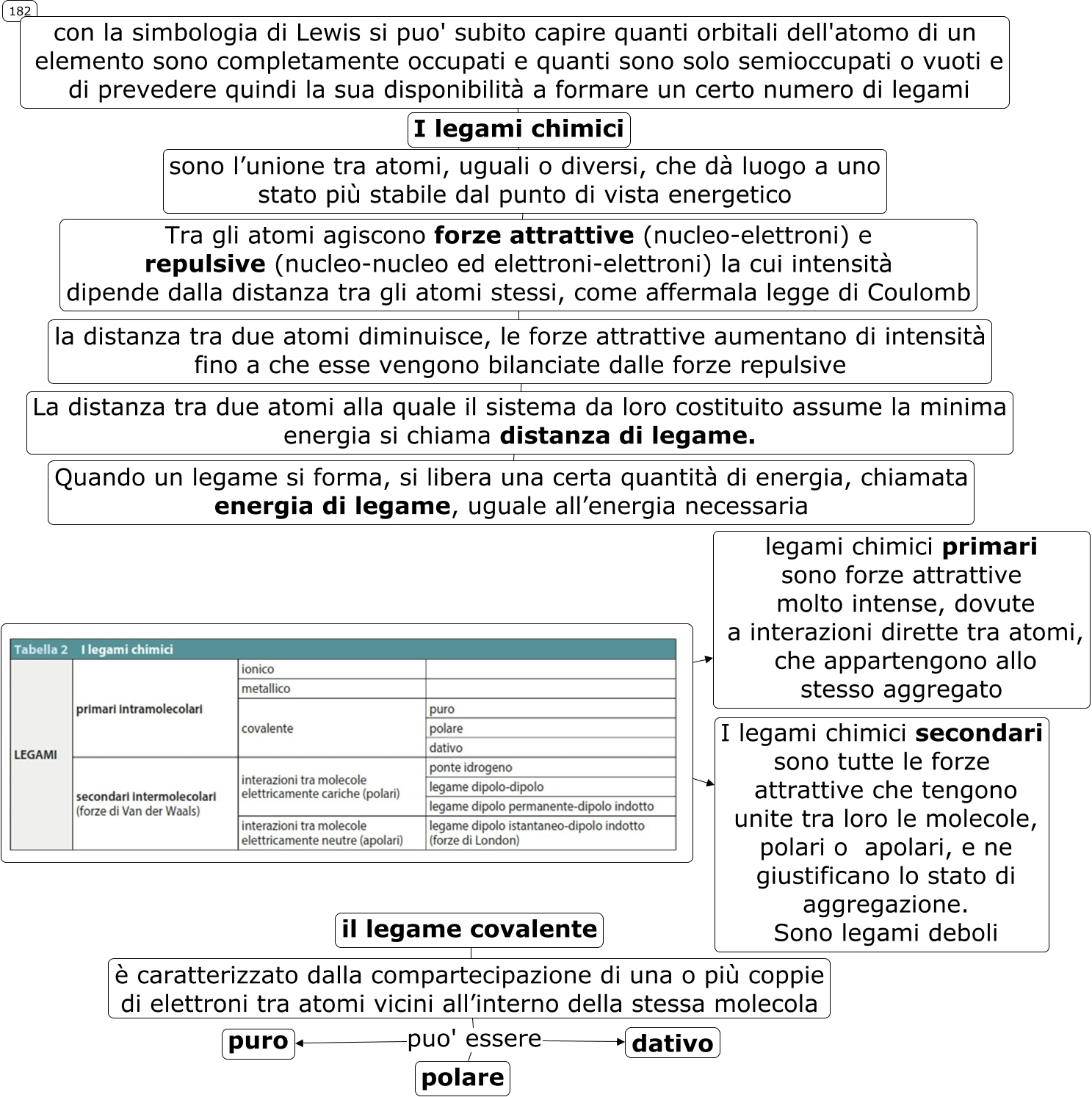Questa Cmap, creata con IHMC CmapTools, contiene informazioni relative a: p.182 legami covalenti, I legami chimici ???? sono l’unione tra atomi, uguali o diversi, che dà luogo a uno stato più stabile dal punto di vista energetico, ???? legami chimici primari sono forze attrattive molto intense, dovute a interazioni dirette tra atomi, che appartengono allo stesso aggregato, sono l’unione tra atomi, uguali o diversi, che dà luogo a uno stato più stabile dal punto di vista energetico ???? Tra gli atomi agiscono forze attrattive (nucleo-elettroni) e repulsive (nucleo-nucleo ed elettroni-elettroni) la cui intensità dipende dalla distanza tra gli atomi stessi, come affermala legge di Coulomb, Tra gli atomi agiscono forze attrattive (nucleo-elettroni) e repulsive (nucleo-nucleo ed elettroni-elettroni) la cui intensità dipende dalla distanza tra gli atomi stessi, come affermala legge di Coulomb ???? la distanza tra due atomi diminuisce, le forze attrattive aumentano di intensità fino a che esse vengono bilanciate dalle forze repulsive, ???? I legami chimici secondari sono tutte le forze attrattive che tengono unite tra loro le molecole, polari o apolari, e ne giustificano lo stato di aggregazione. Sono legami deboli, è caratterizzato dalla compartecipazione di una o più coppie di elettroni tra atomi vicini all’interno della stessa molecola puo' essere dativo, La distanza tra due atomi alla quale il sistema da loro costituito assume la minima energia si chiama distanza di legame. ???? Quando un legame si forma, si libera una certa quantità di energia, chiamata energia di legame, uguale all’energia necessaria, il legame covalente ???? è caratterizzato dalla compartecipazione di una o più coppie di elettroni tra atomi vicini all’interno della stessa molecola, è caratterizzato dalla compartecipazione di una o più coppie di elettroni tra atomi vicini all’interno della stessa molecola puo' essere puro, è caratterizzato dalla compartecipazione di una o più coppie di elettroni tra atomi vicini all’interno della stessa molecola puo' essere polare, la distanza tra due atomi diminuisce, le forze attrattive aumentano di intensità fino a che esse vengono bilanciate dalle forze repulsive ???? La distanza tra due atomi alla quale il sistema da loro costituito assume la minima energia si chiama distanza di legame., con la simbologia di Lewis si puo' subito capire quanti orbitali dell'atomo di un elemento sono completamente occupati e quanti sono solo semioccupati o vuoti e di prevedere quindi la sua disponibilità a formare un certo numero di legami ???? I legami chimici