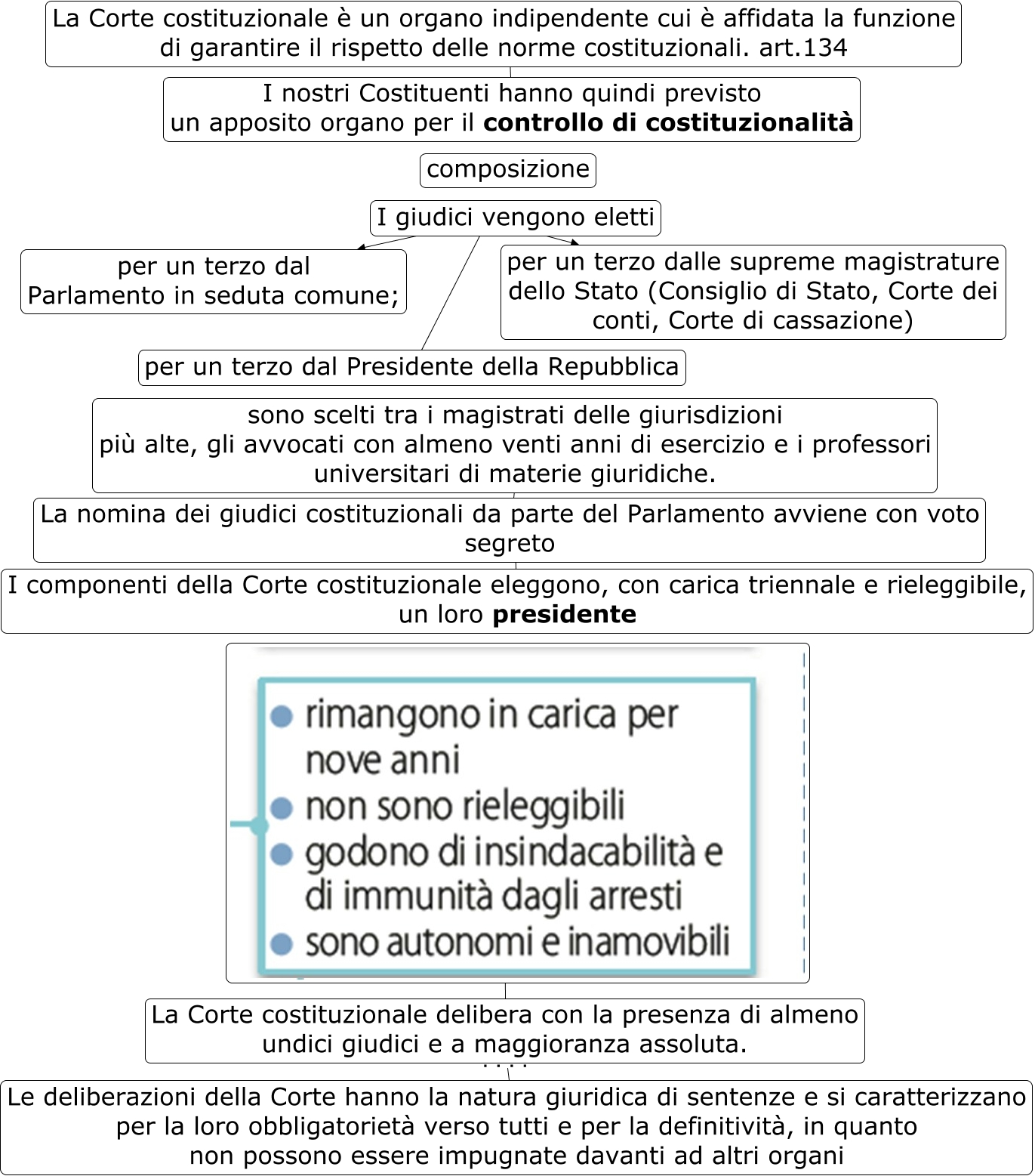 Questa Cmap, creata con IHMC CmapTools, contiene informazioni relative a: pres. rep. p.103, La nomina dei giudici costituzionali da parte del Parlamento avviene con voto segreto ???? I componenti della Corte costituzionale eleggono, con carica triennale e rieleggibile, un loro presidente, I giudici vengono eletti ???? per un terzo dal Presidente della Repubblica, La Corte costituzionale è un organo indipendente cui è affidata la funzione di garantire il rispetto delle norme costituzionali. art.134 ???? I nostri Costituenti hanno quindi previsto un apposito organo per il controllo di costituzionalità, ???? La Corte costituzionale delibera con la presenza di almeno undici giudici e a maggioranza assoluta., sono scelti tra i magistrati delle giurisdizioni più alte, gli avvocati con almeno venti anni di esercizio e i professori universitari di materie giuridiche. ???? La nomina dei giudici costituzionali da parte del Parlamento avviene con voto segreto, I giudici vengono eletti ???? per un terzo dal Parlamento in seduta comune;, La Corte costituzionale delibera con la presenza di almeno undici giudici e a maggioranza assoluta. ???? Le deliberazioni della Corte hanno la natura giuridica di sentenze e si caratterizzano per la loro obbligatorietà verso tutti e per la definitività, in quanto non possono essere impugnate davanti ad altri organi, I giudici vengono eletti ???? per un terzo dalle supreme magistrature dello Stato (Consiglio di Stato, Corte dei conti, Corte di cassazione)