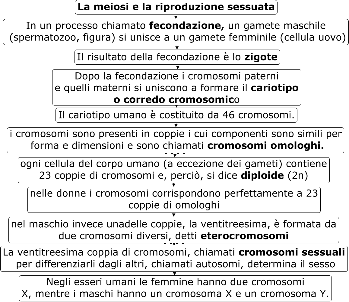 Questa Cmap, creata con IHMC CmapTools, contiene informazioni relative a: p.64 mitosi, Il risultato della fecondazione è lo zigote ???? Dopo la fecondazione i cromosomi paterni e quelli materni si uniscono a formare il cariotipo o corredo cromosomico, ogni cellula del corpo umano (a eccezione dei gameti) contiene 23 coppie di cromosomi e, perciò, si dice diploide (2n) ???? nelle donne i cromosomi corrispondono perfettamente a 23 coppie di omologhi, nel maschio invece unadelle coppie, la ventitreesima, è formata da due cromosomi diversi, detti eterocromosomi ???? La ventitreesima coppia di cromosomi, chiamati cromosomi sessuali per differenziarli dagli altri, chiamati autosomi, determina il sesso, In un processo chiamato fecondazione, un gamete maschile (spermatozoo, figura) si unisce a un gamete femminile (cellula uovo) ???? Il risultato della fecondazione è lo zigote, La ventitreesima coppia di cromosomi, chiamati cromosomi sessuali per differenziarli dagli altri, chiamati autosomi, determina il sesso ???? Negli esseri umani le femmine hanno due cromosomi X, mentre i maschi hanno un cromosoma X e un cromosoma Y., La meiosi e la riproduzione sessuata ???? In un processo chiamato fecondazione, un gamete maschile (spermatozoo, figura) si unisce a un gamete femminile (cellula uovo), Dopo la fecondazione i cromosomi paterni e quelli materni si uniscono a formare il cariotipo o corredo cromosomico ???? Il cariotipo umano è costituito da 46 cromosomi., Il cariotipo umano è costituito da 46 cromosomi. ???? i cromosomi sono presenti in coppie i cui componenti sono simili per forma e dimensioni e sono chiamati cromosomi omologhi., i cromosomi sono presenti in coppie i cui componenti sono simili per forma e dimensioni e sono chiamati cromosomi omologhi. ???? ogni cellula del corpo umano (a eccezione dei gameti) contiene 23 coppie di cromosomi e, perciò, si dice diploide (2n), nelle donne i cromosomi corrispondono perfettamente a 23 coppie di omologhi ???? nel maschio invece unadelle coppie, la ventitreesima, è formata da due cromosomi diversi, detti eterocromosomi