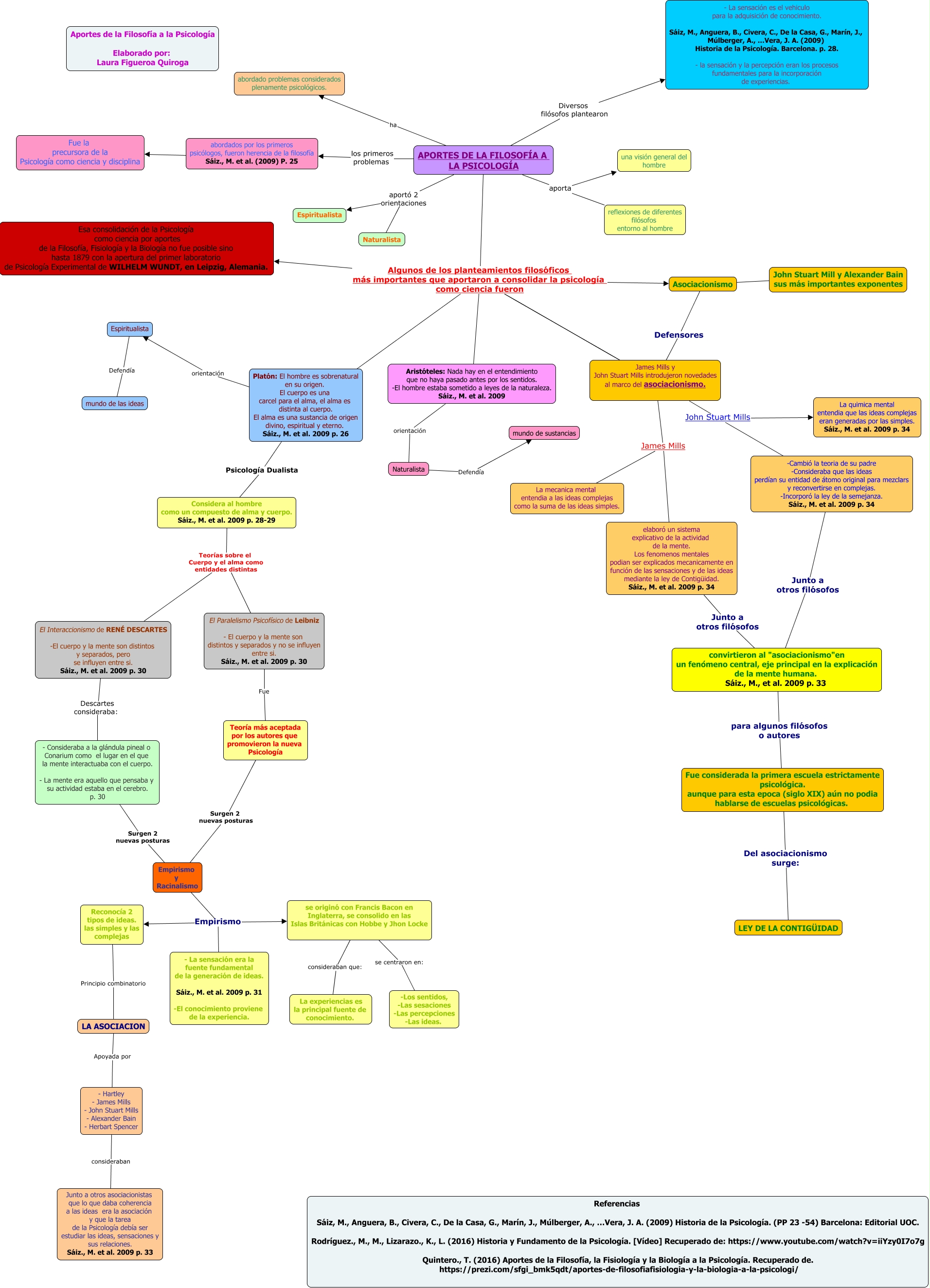 Este Cmap, tiene información relacionada con: Aportes de la Filosofía, Asociacionismo ???? John Stuart Mill y Alexander Bain sus más importantes exponentes, Aristóteles: Nada hay en el entendimiento que no haya pasado antes por los sentidos. -El hombre estaba sometido a leyes de la naturaleza. Sáiz., M. et al. 2009 orientación Naturalista, APORTES DE LA FILOSOFÍA A LA PSICOLOGÍA Algunos de los planteamientos filosóficos más importantes que aportaron a consolidar la psicología como ciencia fueron James Mills y John Stuart Mills introdujeron novedades al marco del asociacionismo., APORTES DE LA FILOSOFÍA A LA PSICOLOGÍA Diversos filósofos plantearon - La sensación es el vehiculo para la adquisición de conocimiento. Sáiz, M., Anguera, B., Civera, C., De la Casa, G., Marín, J., Múlberger, A., …Vera, J. A. (2009) Historia de la Psicología. Barcelona. p. 28. - la sensación y la percepción eran los procesos fundamentales para la incorporación de experiencias., elaboró un sistema explicativo de la actividad de la mente. Los fenomenos mentales podian ser explicados mecanicamente en función de las sensaciones y de las ideas mediante la ley de Contigüidad. Sáiz., M. et al. 2009 p. 34 Junto a otros filósofos convirtieron al "asociacionismo"en un fenómeno central, eje principal en la explicación de la mente humana. Sáiz., M., et al. 2009 p. 33, abordados por los primeros psicólogos, fueron herencia de la filosofía Sáiz., M. et al. (2009) P. 25 ???? Fue la precursora de la Psicología como ciencia y disciplina, APORTES DE LA FILOSOFÍA A LA PSICOLOGÍA Algunos de los planteamientos filosóficos más importantes que aportaron a consolidar la psicología como ciencia fueron Asociacionismo, Considera al hombre como un compuesto de alma y cuerpo. Sáiz., M. et al. 2009 p. 28-29 Teorías sobre el Cuerpo y el alma como entidades distintas El Interaccionismo de RENÉ DESCARTES -El cuerpo y la mente son distintos y separados, pero se influyen entre si. Sáiz., M. et al. 2009 p. 30, Naturalista Defendía mundo de sustancias, - Consideraba a la glándula pineal o Conarium como el lugar en el que la mente interactuaba con el cuerpo. - La mente era aquello que pensaba y su actividad estaba en el cerebro. p. 30 Surgen 2 nuevas posturas Empirismo y Racinalismo, APORTES DE LA FILOSOFÍA A LA PSICOLOGÍA aportó 2 orientaciones Naturalista, Espiritualista Defendía mundo de las ideas, se originó con Francis Bacon en Inglaterra, se consolido en las Islas Británicas con Hobbe y Jhon Locke consideraban que: La experiencias es la principal fuente de conocimiento., El Interaccionismo de RENÉ DESCARTES -El cuerpo y la mente son distintos y separados, pero se influyen entre si. Sáiz., M. et al. 2009 p. 30 Descartes consideraba: - Consideraba a la glándula pineal o Conarium como el lugar en el que la mente interactuaba con el cuerpo. - La mente era aquello que pensaba y su actividad estaba en el cerebro. p. 30, James Mills y John Stuart Mills introdujeron novedades al marco del asociacionismo. John Stuart Mills -Cambió la teoria de su padre -Consideraba que las ideas perdían su entidad de átomo original para mezclars y reconvertirse en complejas. -Incorporó la ley de la semejanza. Sáiz., M. et al. 2009 p. 34, APORTES DE LA FILOSOFÍA A LA PSICOLOGÍA Algunos de los planteamientos filosóficos más importantes que aportaron a consolidar la psicología como ciencia fueron Platón: El hombre es sobrenatural en su origen. El cuerpo es una carcel para el alma, el alma es distinta al cuerpo. El alma es una sustancia de origen divino, espiritual y eterno. Sáiz., M. et al. 2009 p. 26, APORTES DE LA FILOSOFÍA A LA PSICOLOGÍA Algunos de los planteamientos filosóficos más importantes que aportaron a consolidar la psicología como ciencia fueron Aristóteles: Nada hay en el entendimiento que no haya pasado antes por los sentidos. -El hombre estaba sometido a leyes de la naturaleza. Sáiz., M. et al. 2009, Empirismo y Racinalismo Empirismo Reconocía 2 tipos de ideas. las simples y las complejas, APORTES DE LA FILOSOFÍA A LA PSICOLOGÍA ha abordado problemas considerados plenamente psicológicos., APORTES DE LA FILOSOFÍA A LA PSICOLOGÍA aporta reflexiones de diferentes filósofos entorno al hombre