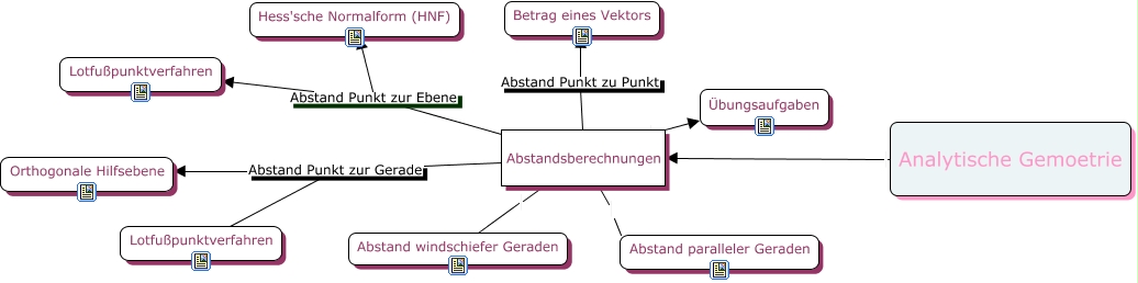 Dieses mit IHMC CmapTools erstellte CMap hat Informationen bezüglich: Analytische Gemoetrie, Abstandsberechnungen Abstand Punkt zur Gerade Orthogonale Hilfsebene, Analytische Gemoetrie Abstandsberechnungen, Abstandsberechnungen Abstand Punkt zur Ebene Hess'sche Normalform (HNF), Abstandsberechnungen Übungsaufgaben, Abstandsberechnungen Abstand Punkt zu Punkt Betrag eines Vektors, Abstandsberechnungen Abstand Punkt zur Gerade Lotfußpunktverfahren, Abstandsberechnungen Abstand Punkt zur Ebene Lotfußpunktverfahren, Abstandsberechnungen Abstand windschiefer Geraden, Abstandsberechnungen Abstand paralleler Geraden