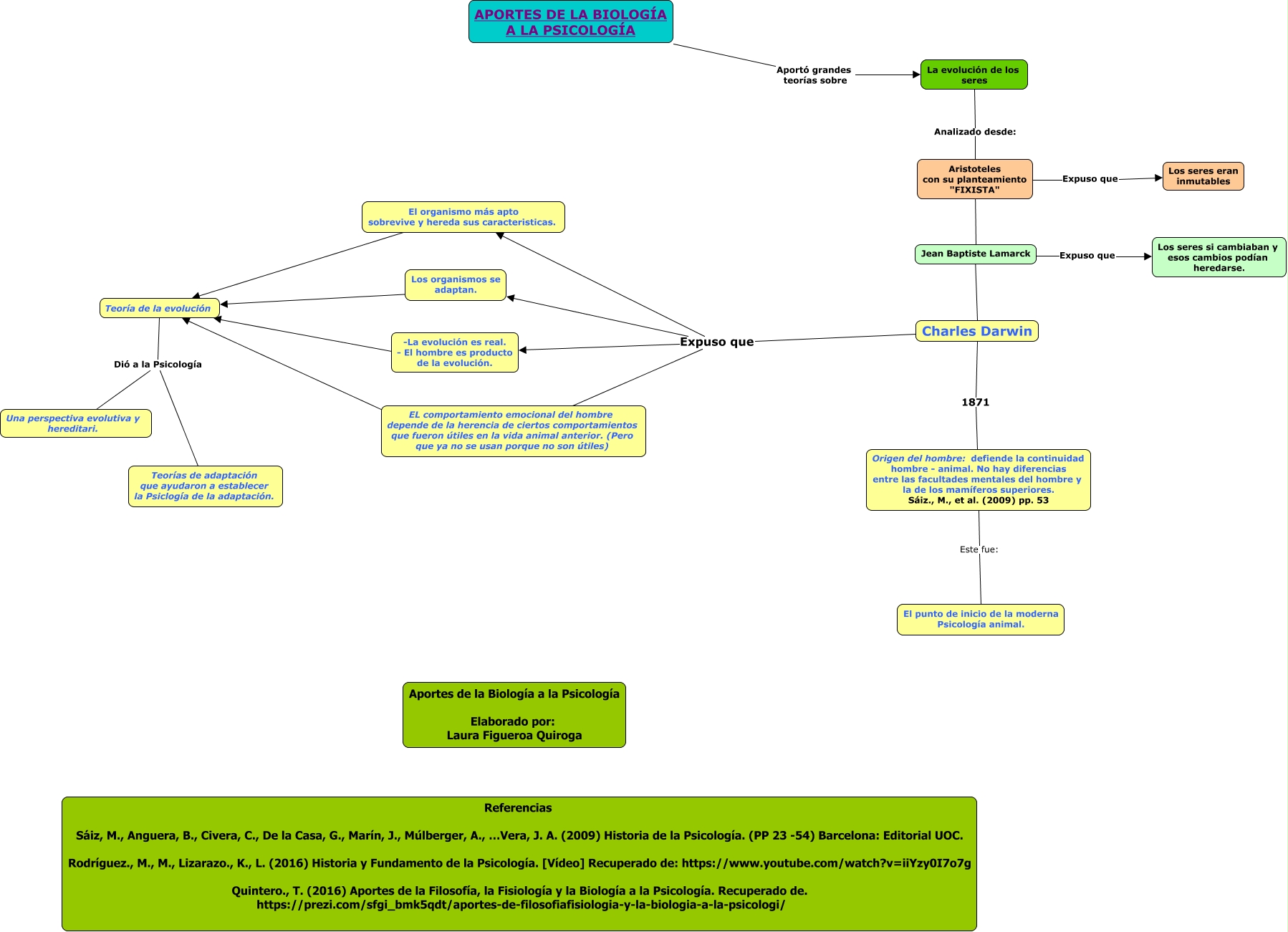 Este Cmap, tiene información relacionada con: Aportes de la Biología, Charles Darwin Expuso que EL comportamiento emocional del hombre depende de la herencia de ciertos comportamientos que fueron útiles en la vida animal anterior. (Pero que ya no se usan porque no son útiles), APORTES DE LA BIOLOGÍA A LA PSICOLOGÍA Aportó grandes teorías sobre La evolución de los seres, Aristoteles con su planteamiento "FIXISTA" Expuso que Los seres eran inmutables, -La evolución es real. - El hombre es producto de la evolución. ???? Teoría de la evolución, Charles Darwin Expuso que Los organismos se adaptan., Los organismos se adaptan. ???? Teoría de la evolución, Charles Darwin 1871 Origen del hombre: defiende la continuidad hombre - animal. No hay diferencias entre las facultades mentales del hombre y la de los mamíferos superiores. Sáiz., M., et al. (2009) pp. 53, El organismo más apto sobrevive y hereda sus caracteristicas. ???? Teoría de la evolución, Jean Baptiste Lamarck ???? Charles Darwin, Charles Darwin Expuso que El organismo más apto sobrevive y hereda sus caracteristicas., Jean Baptiste Lamarck Expuso que Los seres si cambiaban y esos cambios podían heredarse., EL comportamiento emocional del hombre depende de la herencia de ciertos comportamientos que fueron útiles en la vida animal anterior. (Pero que ya no se usan porque no son útiles) ???? Teoría de la evolución, Origen del hombre: defiende la continuidad hombre - animal. No hay diferencias entre las facultades mentales del hombre y la de los mamíferos superiores. Sáiz., M., et al. (2009) pp. 53 Este fue: El punto de inicio de la moderna Psicología animal., Aristoteles con su planteamiento "FIXISTA" ???? Jean Baptiste Lamarck, La evolución de los seres Analizado desde: Aristoteles con su planteamiento "FIXISTA", Charles Darwin Expuso que -La evolución es real. - El hombre es producto de la evolución., Teoría de la evolución Dió a la Psicología Una perspectiva evolutiva y hereditari., Teoría de la evolución Dió a la Psicología Teorías de adaptación que ayudaron a establecer la Psiclogía de la adaptación.