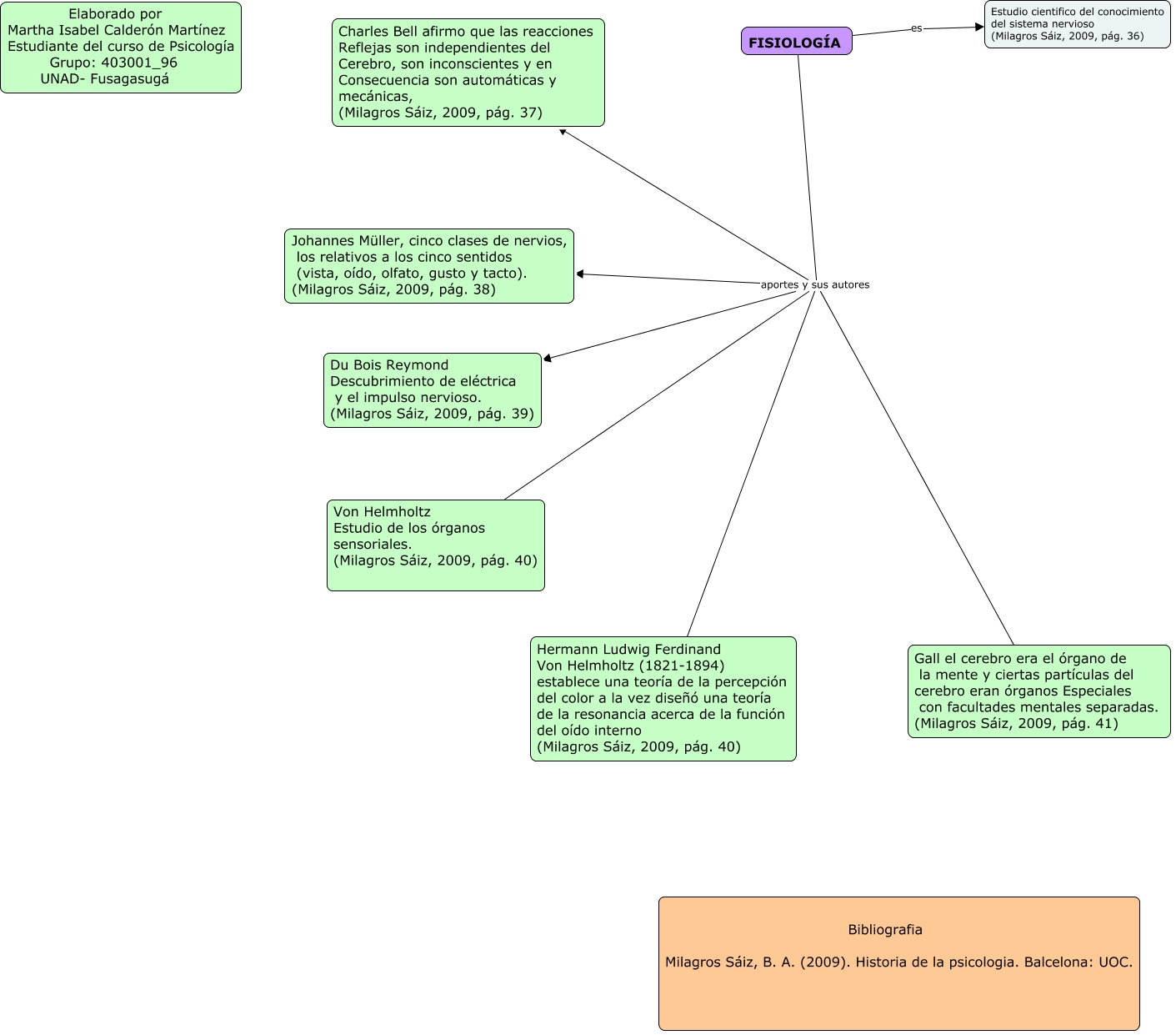 Este Cmap, tiene información relacionada con: HISTORIA DE LA FISIOLOGÍA, FISIOLOGÍA aportes y sus autores Johannes Müller, cinco clases de nervios, los relativos a los cinco sentidos (vista, oído, olfato, gusto y tacto). (Milagros Sáiz, 2009, pág. 38), FISIOLOGÍA aportes y sus autores Du Bois Reymond Descubrimiento de eléctrica y el impulso nervioso. (Milagros Sáiz, 2009, pág. 39), FISIOLOGÍA aportes y sus autores Hermann Ludwig Ferdinand Von Helmholtz (1821-1894) establece una teoría de la percepción del color a la vez diseñó una teoría de la resonancia acerca de la función del oído interno (Milagros Sáiz, 2009, pág. 40), FISIOLOGÍA aportes y sus autores Von Helmholtz Estudio de los órganos sensoriales. (Milagros Sáiz, 2009, pág. 40), FISIOLOGÍA aportes y sus autores Gall el cerebro era el órgano de la mente y ciertas partículas del cerebro eran órganos Especiales con facultades mentales separadas. (Milagros Sáiz, 2009, pág. 41), FISIOLOGÍA aportes y sus autores Charles Bell afirmo que las reacciones Reflejas son independientes del Cerebro, son inconscientes y en Consecuencia son automáticas y mecánicas, (Milagros Sáiz, 2009, pág. 37), FISIOLOGÍA es Estudio cientifico del conocimiento del sistema nervioso (Milagros Sáiz, 2009, pág. 36)