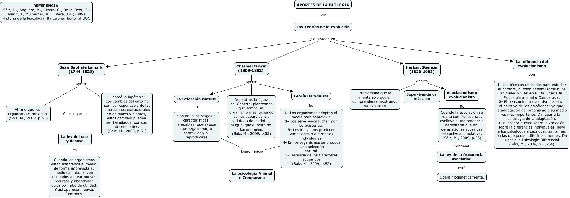 Este Cmap, tiene información relacionada con: Aportes de la Biología a la Historia de la Psicología, Charles Darwin (1809-1882) Aporto Dejo atrás la figura del Génesis, planteando que somos un organismo mas luchando por su supervivencia y dotado de instintos, al igual que el resto de los animales. (Sáiz, M., 2009, p.52), 1- Los organismos adoptan al medio para sobrevivir. 2- Los seres vivos luchan por su existencia. 3- Los individuos producen variaciones o diferencias individuales. 4- En los organismos se produce una selección natural. 5- Herencia de los Carácteres adquiridos (Sáiz, M., 2009, p.52) Dieron inicio La psicología Animal o Comparada, Son aquellos rasgos o características heredables, que ayudan a un organismo; a sobrevivir y a reproducirse Dieron inicio La psicología Animal o Comparada, Cuando la asociación se repite con frencuencia, conlleva a una tendencia hereditaria que en generaciones sucesivas se vuelve acumulativa. (Sáiz, M., 2009, p.53) Contiene La ley de la frecuencia asociativa, Planteó la hipótesis: Los cambios del entorno son los responsable de las alteraciones estructurales en animales y plantas, estos cambios pueden ser heredados, por sus decendientes. (Sáiz, M., 2009, p.51) Construyeron La ley del uso y desuso, Las Teorías de la Evolución Se Dividen en Charles Darwin (1809-1882), Las Teorías de la Evolución Se Dividen en La influencia del evolucionismo, Jean Baptiste Lamark (1744-1829) Aporto Afirmo que los organismo cambiaban. (Sáiz, M., 2009, p.51), La ley de la frecuencia asociativa Está Opera filogenéticamente., Dejo atrás la figura del Génesis, planteando que somos un organismo mas luchando por su supervivencia y dotado de instintos, al igual que el resto de los animales. (Sáiz, M., 2009, p.52) Dieron inicio La psicología Animal o Comparada, La ley del uso y desuso Es Cuando los organismos estan adaptados al medio, de forma imprevista su medio cambia, se ven obligados a crear nuevos recursos y abandonar otros por falta de utilidad. Y así aparecen nuevas funciones., Afirmo que los organismo cambiaban. (Sáiz, M., 2009, p.51) Construyeron La ley del uso y desuso, APORTES DE LA BIOLOGÍA Son Las Teorías de la Evolución, Teoría Darwinista Es 1- Los organismos adoptan al medio para sobrevivir. 2- Los seres vivos luchan por su existencia. 3- Los individuos producen variaciones o diferencias individuales. 4- En los organismos se produce una selección natural. 5- Herencia de los Carácteres adquiridos (Sáiz, M., 2009, p.52), La influencia del evolucionismo Son 1- Las técnicas utilizadas para estudiar al hombre, pueden generalizarse a los animales y viseversa. Da lugar a la Psicología animal o Comparada. 2- El pensamiento evolutivo desplaza el objetivo de los psicólogos; ya que, la adaptación del organismo a su medio es más importante. Da lugar a la psicología de la adaptación. 3- El acento puesto sobre la variación, sobre la diferencias individuales, llevó a los psicólogos a catalogar las formas en las que podían diferir las mentes. Da Lugar a la Psicología Diferencial. (Sáiz, M., 2009, p.53-54), Asociacionismo evolucionista Es Cuando la asociación se repite con frencuencia, conlleva a una tendencia hereditaria que en generaciones sucesivas se vuelve acumulativa. (Sáiz, M., 2009, p.53), Herbart Spencer (1820-1903) Aporto Asociacionismo evolucionista, Herbart Spencer (1820-1903) Aporto Supervivencia del más apto, Jean Baptiste Lamark (1744-1829) Aporto Planteó la hipótesis: Los cambios del entorno son los responsable de las alteraciones estructurales en animales y plantas, estos cambios pueden ser heredados, por sus decendientes. (Sáiz, M., 2009, p.51), Las Teorías de la Evolución Se Dividen en Herbart Spencer (1820-1903)