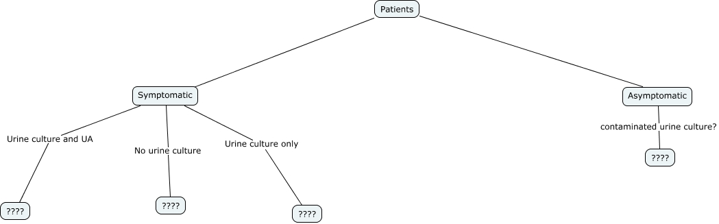 This Concept Map, created with IHMC CmapTools, has information related to: Urine cultures, Patients ???? Symptomatic, Patients ???? Asymptomatic, Symptomatic Urine culture and UA ????, Symptomatic No urine culture ????, Symptomatic Urine culture only ????, Asymptomatic contaminated urine culture? ????