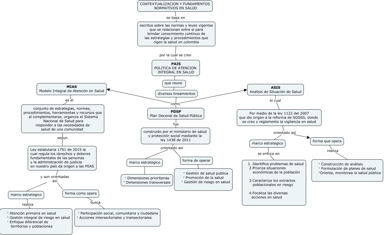 Este Cmap, tiene información relacionada con: ley estatutaria de salud, CONTEXTUALIZACION Y FUNDAMENTOS NORMATIVOS EN SALUD se basa en escritos sobre las normas y leyes vigentes que se relacionan entre si para brindar conocimiento continuo de las estrategias y procedimientos que rigen la salud en colombia, diversos lineamientos como MIAS Modelo Integral de Atención en Salud, conjunto de estrategias, normas, procedimientos, herramientas y recursos que al complementarse, organiza el Sistema Nacional de Salud para responder a las necesidades de salud de una comunidad segun Ley estatutaria 1751 de 2015 la cual regula los derechos y deberes fundamentales de las personas y la administración de justicia en nuestro país da origen a las MIAS, Ley estatutaria 1751 de 2015 la cual regula los derechos y deberes fundamentales de las personas y la administración de justicia en nuestro país da origen a las MIAS y son orientadas así marco estrategico, Ley estatutaria 1751 de 2015 la cual regula los derechos y deberes fundamentales de las personas y la administración de justicia en nuestro país da origen a las MIAS y son orientadas así forma como opera, marco estrategico se enfoca en 1. Identifica problemas de salud 2.Prioriza situaciones económicas de la población 3.Caracteriza los extractos poblacionales en riesgo 4.Focaliza las diversas acciones en salud, Por medio de la ley 1122 del 2007 que dio origen a la reforma de SGSSS, donde se creo y reglamento la vigilancia en salud orientado así forma que opera, forma de operar ???? ° Gestión de salud publica ° Promoción de la salud ° Gestión de riesgo en salud, diversos lineamientos como PDSP Plan Decenal de Salud Pública, que reune ???? PAIS POLITICA DE ATENCION INTEGRAL EN SALUD, escritos sobre las normas y leyes vigentes que se relacionan entre si para brindar conocimiento continuo de las estrategias y procedimientos que rigen la salud en colombia por la cual se creo PAIS POLITICA DE ATENCION INTEGRAL EN SALUD, construido por el ministerio de salud y protección social mediante la ley 1438 de 2011 orientado asï marco estrategico, marco estrategico ???? ° Dimensiones prioritarias ° Dimensiones transversale, Por medio de la ley 1122 del 2007 que dio origen a la reforma de SGSSS, donde se creo y reglamento la vigilancia en salud orientado así marco estrategico, construido por el ministerio de salud y protección social mediante la ley 1438 de 2011 orientado asï forma de operar, forma como opera busca ° Participación social, comunitaria y ciudadana ° Acciones intersectoriales y transectoriales, diversos lineamientos como ASIS Analisis de Situación de Salud, marco estrategico realiza ° Atención primaria en salud ° Gestión integral de riesgo en salud ° Enfoque diferencial de territorios y poblaciones, MIAS Modelo Integral de Atención en Salud es el conjunto de estrategias, normas, procedimientos, herramientas y recursos que al complementarse, organiza el Sistema Nacional de Salud para responder a las necesidades de salud de una comunidad, forma que opera realiza ° Construcción de análisis ° Formulación de planes de salud °Orienta, monitorea la salud pública
