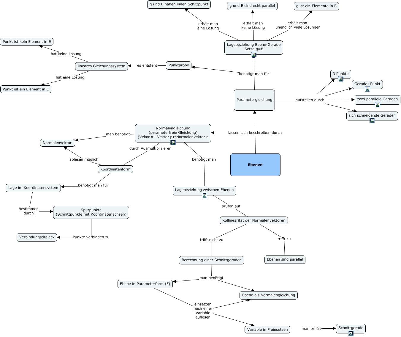 Dieses mit IHMC CmapTools erstellte CMap hat Informationen bezüglich: Finale Form von Ebenen, Koordinatenform ablesen möglich Normalenvektor, Lagebeziehung Ebene-Gerade Setze g=E erhält man keine Lösung g und E sind echt parallel, Parametergleichung aufstellen durch zwei parallele Geraden, Parametergleichung benötigt man für Lagebeziehung Ebene-Gerade Setze g=E, Lagebeziehung Ebene-Gerade Setze g=E erhält man eine Lösung g und E haben einen Schittpunkt, Parametergleichung aufstellen durch 3 Punkte, Parametergleichung benötigt man für Punktprobe, Ebenen lassen sich beschreiben durch Normalengleichung (parameterfreie Gleichung) (Vekor x - Vektor p)*Normalenvektor n, Kollinearität der Normalenvektoren trifft nicht zu Berechnung einer Schnittgeraden, Variable in F einsetzen man erhält Schnittgerade, Ebene in Parameterform (F) einsetzen nach einer Variable auflösen Ebene als Normalengleichung, Lagebeziehung zwischen Ebenen prüfen auf Kollinearität der Normalenvektoren, Berechnung einer Schnittgeraden man benötigt Ebene in Parameterform (F), lineares Gleichungssystem hat keine Lösung Punkt ist kein Element in E, Normalengleichung (parameterfreie Gleichung) (Vekor x - Vektor p)*Normalenvektor n durch Ausmultiplizieren Koordinatenform, Parametergleichung aufstellen durch Gerade+Punkt, Ebenen lassen sich beschreiben durch Parametergleichung, Normalengleichung (parameterfreie Gleichung) (Vekor x - Vektor p)*Normalenvektor n man benötigt Normalenvektor, Parametergleichung aufstellen durch sich schneidende Geraden, Spurpunkte (Schnittpunkte mit Koordinatenachsen) Punkte verbinden zu Verbindungsdreieck