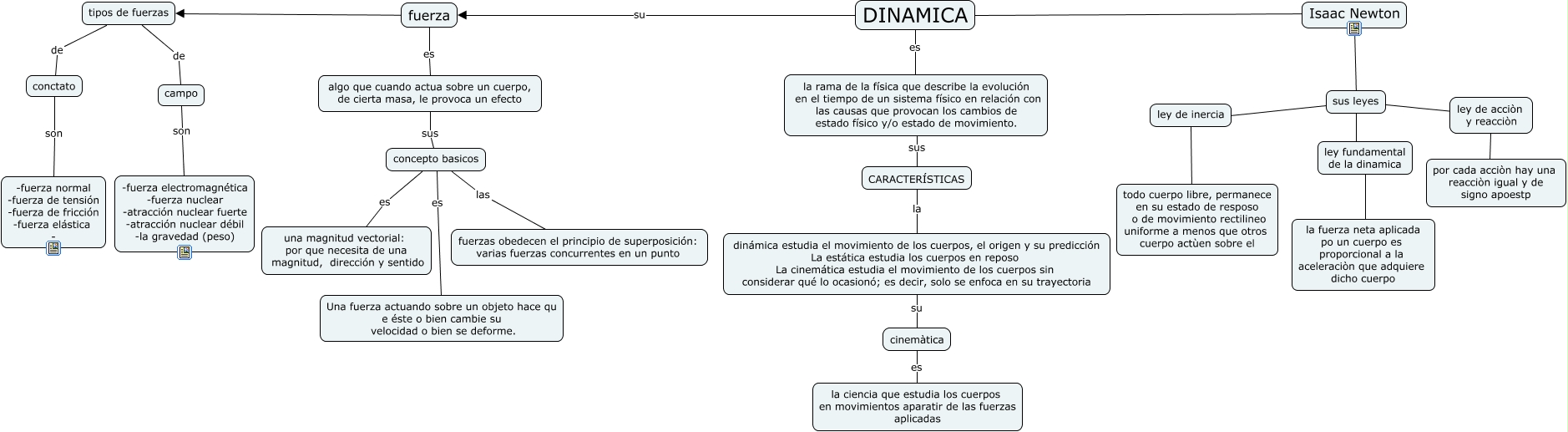 Este Cmap, tiene información relacionada con: mapa de fisica mecanida-dinamica 3, sus leyes ???? ley fundamental de la dinamica, ley de inercia ???? todo cuerpo libre, permanece en su estado de resposo o de movimiento rectilineo uniforme a menos que otros cuerpo actùen sobre el, concepto basicos es Una fuerza actuando sobre un objeto hace qu e éste o bien cambie su velocidad o bien se deforme., tipos de fuerzas de campo, fuerza tipos de fuerzas, Isaac Newton ???? sus leyes, dinámica estudia el movimiento de los cuerpos, el origen y su predicción La estática estudia los cuerpos en reposo La cinemática estudia el movimiento de los cuerpos sin considerar qué lo ocasionó; es decir, solo se enfoca en su trayectoria su cinemàtica, la rama de la física que describe la evolución en el tiempo de un sistema físico en relación con las causas que provocan los cambios de estado físico y/o estado de movimiento. sus CARACTERÍSTICAS, tipos de fuerzas de conctato, conctato son -fuerza normal -fuerza de tensión -fuerza de fricción -fuerza elástica -, campo son -fuerza electromagnética -fuerza nuclear -atracción nuclear fuerte -atracción nuclear débil -la gravedad (peso), sus leyes ???? ley de inercia, cinemàtica es la ciencia que estudia los cuerpos en movimientos aparatir de las fuerzas aplicadas, DINAMICA su fuerza, sus leyes ???? ley de acciòn y reacciòn, DINAMICA es la rama de la física que describe la evolución en el tiempo de un sistema físico en relación con las causas que provocan los cambios de estado físico y/o estado de movimiento., algo que cuando actua sobre un cuerpo, de cierta masa, le provoca un efecto sus concepto basicos, CARACTERÍSTICAS la dinámica estudia el movimiento de los cuerpos, el origen y su predicción La estática estudia los cuerpos en reposo La cinemática estudia el movimiento de los cuerpos sin considerar qué lo ocasionó; es decir, solo se enfoca en su trayectoria, DINAMICA ???? Isaac Newton, concepto basicos es una magnitud vectorial: por que necesita de una magnitud, dirección y sentido