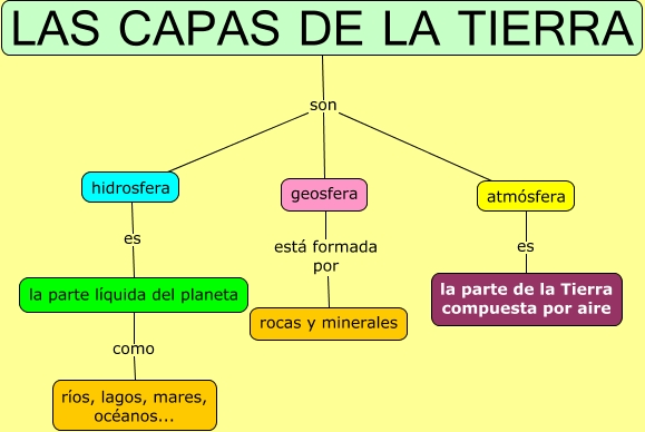 Este Cmap, tiene información relacionada con: Las capas de la Tierra, LAS CAPAS DE LA TIERRA son hidrosfera, geosfera está formada por rocas y minerales, la parte líquida del planeta como ríos, lagos, mares, océanos..., hidrosfera es la parte líquida del planeta, LAS CAPAS DE LA TIERRA son atmósfera, LAS CAPAS DE LA TIERRA son geosfera, atmósfera es la parte de la Tierra compuesta por aire