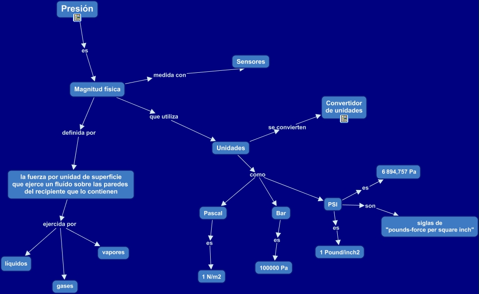 Este Cmap, tiene información relacionada con: 0.- Sensores de presión, PSI es 1 Pound/inch2, Unidades como Bar, PSI es 6 894,757 Pa, Unidades como PSI, Bar es 100000 Pa, la fuerza por unidad de superficie que ejerce un fluído sobre las paredes del recipiente que lo contienen ejercida por vapores, Pascal es 1 N/m2, Unidades se convierten Convertidor de unidades, Magnitud física medida con Sensores, Magnitud física que utiliza Unidades, PSI son siglas de "pounds-force per square inch", Unidades como Pascal, Presión es Magnitud física, Magnitud física definida por la fuerza por unidad de superficie que ejerce un fluído sobre las paredes del recipiente que lo contienen, la fuerza por unidad de superficie que ejerce un fluído sobre las paredes del recipiente que lo contienen ejercida por líquidos, la fuerza por unidad de superficie que ejerce un fluído sobre las paredes del recipiente que lo contienen ejercida por gases