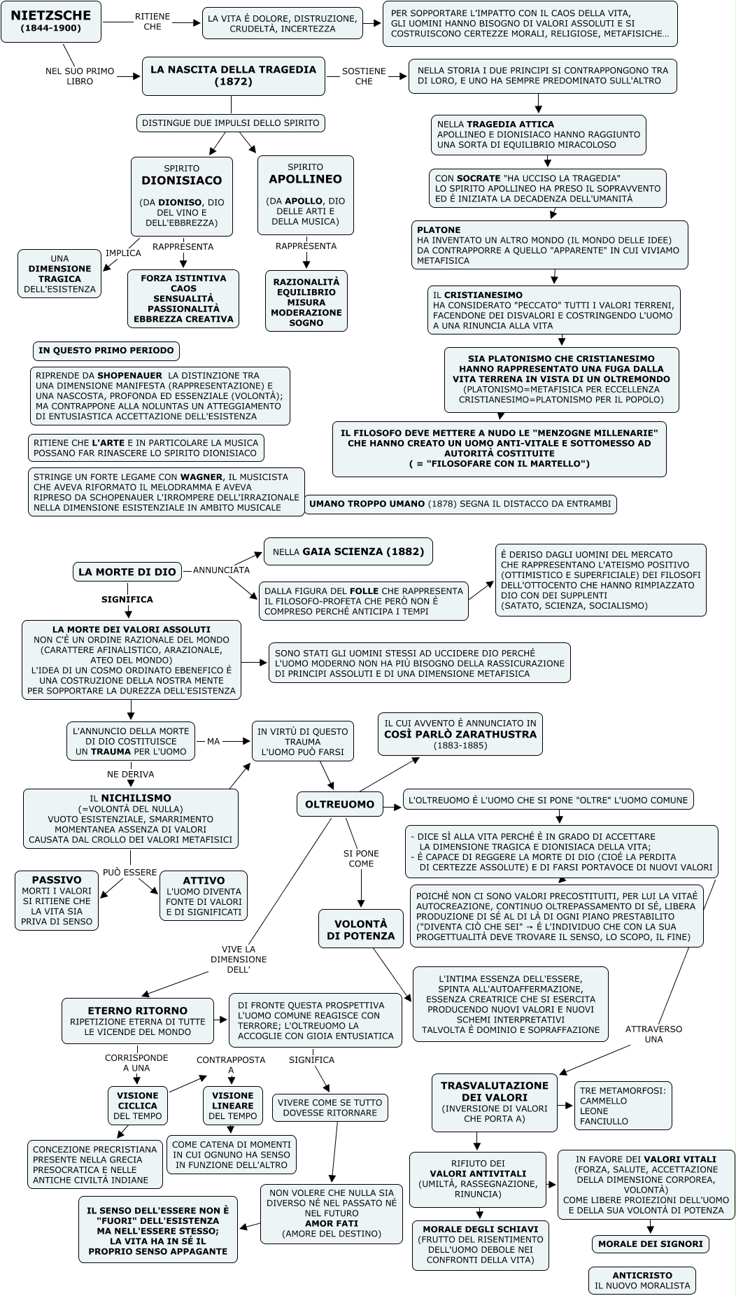 Questa Cmap, creata con IHMC CmapTools, contiene informazioni relative a: NIETZSCHE, TRASVALUTAZIONE DEI VALORI (INVERSIONE DI VALORI CHE PORTA A) ???? RIFIUTO DEI VALORI ANTIVITALI (UMILTÀ, RASSEGNAZIONE, RINUNCIA), NELLA STORIA I DUE PRINCIPI SI CONTRAPPONGONO TRA DI LORO, E UNO HA SEMPRE PREDOMINATO SULL'ALTRO ???? NELLA TRAGEDIA ATTICA APOLLINEO E DIONISIACO HANNO RAGGIUNTO UNA SORTA DI EQUILIBRIO MIRACOLOSO, - DICE SÌ ALLA VITA PERCHÉ È IN GRADO DI ACCETTARE LA DIMENSIONE TRAGICA E DIONISIACA DELLA VITA; - È CAPACE DI REGGERE LA MORTE DI DIO (CIOÉ LA PERDITA DI CERTEZZE ASSOLUTE) E DI FARSI PORTAVOCE DI NUOVI VALORI ???? POICHÉ NON CI SONO VALORI PRECOSTITUITI, PER LUI LA VITAÈ AUTOCREAZIONE, CONTINUO OLTREPASSAMENTO DI SÉ, LIBERA PRODUZIONE DI SÉ AL DI LÀ DI OGNI PIANO PRESTABILITO ("DIVENTA CIÒ CHE SEI" → È L'INDIVIDUO CHE CON LA SUA PROGETTUALITÀ DEVE TROVARE IL SENSO, LO SCOPO, IL FINE), VISIONE LINEARE DEL TEMPO ???? COME CATENA DI MOMENTI IN CUI OGNUNO HA SENSO IN FUNZIONE DELL'ALTRO, ETERNO RITORNO RIPETIZIONE ETERNA DI TUTTE LE VICENDE DEL MONDO CORRISPONDE A UNA VISIONE CICLICA DEL TEMPO, SIA PLATONISMO CHE CRISTIANESIMO HANNO RAPPRESENTATO UNA FUGA DALLA VITA TERRENA IN VISTA DI UN OLTREMONDO (PLATONISMO=METAFISICA PER ECCELLENZA CRISTIANESIMO=PLATONISMO PER IL POPOLO) ???? IL FILOSOFO DEVE METTERE A NUDO LE "MENZOGNE MILLENARIE" CHE HANNO CREATO UN UOMO ANTI-VITALE E SOTTOMESSO AD AUTORITÀ COSTITUITE ( = "FILOSOFARE CON IL MARTELLO"), LA MORTE DI DIO SIGNIFICA LA MORTE DEI VALORI ASSOLUTI NON C'È UN ORDINE RAZIONALE DEL MONDO (CARATTERE AFINALISTICO, ARAZIONALE, ATEO DEL MONDO) L'IDEA DI UN COSMO ORDINATO EBENEFICO È UNA COSTRUZIONE DELLA NOSTRA MENTE PER SOPPORTARE LA DUREZZA DELL'ESISTENZA, NIETZSCHE (1844-1900) RITIENE CHE LA VITA È DOLORE, DISTRUZIONE, CRUDELTÀ, INCERTEZZA, LA NASCITA DELLA TRAGEDIA (1872) ???? DISTINGUE DUE IMPULSI DELLO SPIRITO, DISTINGUE DUE IMPULSI DELLO SPIRITO ???? SPIRITO APOLLINEO H (DA APOLLO, DIO DELLE ARTI E DELLA MUSICA), CON SOCRATE "HA UCCISO LA TRAGEDIA" LO SPIRITO APOLLINEO HA PRESO IL SOPRAVVENTO ED È INIZIATA LA DECADENZA DELL'UMANITÀ ???? PLATONE HA INVENTATO UN ALTRO MONDO (IL MONDO DELLE IDEE) DA CONTRAPPORRE A QUELLO "APPARENTE" IN CUI VIVIAMO METAFISICA, SPIRITO DIONISIACO H (DA DIONISO, DIO DEL VINO E DELL'EBBREZZA) IMPLICA UNA DIMENSIONE TRAGICA DELL'ESISTENZA, NIETZSCHE (1844-1900) NEL SUO PRIMO LIBRO LA NASCITA DELLA TRAGEDIA (1872), ETERNO RITORNO RIPETIZIONE ETERNA DI TUTTE LE VICENDE DEL MONDO ???? DI FRONTE QUESTA PROSPETTIVA L'UOMO COMUNE REAGISCE CON TERRORE; L'OLTREUOMO LA ACCOGLIE CON GIOIA ENTUSIATICA, DI FRONTE QUESTA PROSPETTIVA L'UOMO COMUNE REAGISCE CON TERRORE; L'OLTREUOMO LA ACCOGLIE CON GIOIA ENTUSIATICA SIGNIFICA VIVERE COME SE TUTTO DOVESSE RITORNARE, RIFIUTO DEI VALORI ANTIVITALI (UMILTÀ, RASSEGNAZIONE, RINUNCIA) ???? MORALE DEGLI SCHIAVI (FRUTTO DEL RISENTIMENTO DELL'UOMO DEBOLE NEI CONFRONTI DELLA VITA), TRASVALUTAZIONE DEI VALORI (INVERSIONE DI VALORI CHE PORTA A) ???? TRE METAMORFOSI: CAMMELLO LEONE FANCIULLO, VOLONTÀ DI POTENZA ???? L'INTIMA ESSENZA DELL'ESSERE, SPINTA ALL'AUTOAFFERMAZIONE, ESSENZA CREATRICE CHE SI ESERCITA PRODUCENDO NUOVI VALORI E NUOVI SCHEMI INTERPRETATIVI TALVOLTA È DOMINIO E SOPRAFFAZIONE, OLTREUOMO ???? L'OLTREUOMO È L'UOMO CHE SI PONE "OLTRE" L'UOMO COMUNE, SPIRITO DIONISIACO H (DA DIONISO, DIO DEL VINO E DELL'EBBREZZA) RAPPRESENTA FORZA ISTINTIVA CAOS SENSUALITÀ PASSIONALITÀ EBBREZZA CREATIVA