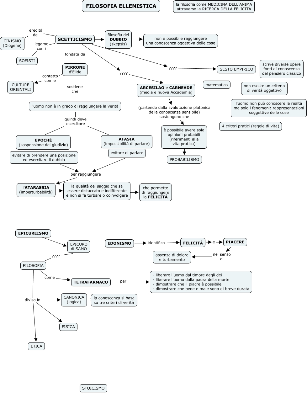 Questa Cmap, creata con IHMC CmapTools, contiene informazioni relative a: FILOSOFIA ELLENISTICA, EPICURO di SAMO ???? FILOSOFIA, l'uomo non è in grado di raggiungere la verità quindi deve esercitare EPOCHÉ (sospensione del giudizio), PIRRONE d'Elide contatto con le CULTURE ORIENTALI, EDONISMO identifica FELICITÀ, PIACERE nel senso di assenza di dolore e turbamento, TETRAFARMACO per - liberare l'uomo dal timore degli dei - liberare l'uomo dalla paura della morte - dimostrare che il piacre è possibile - dimostrare che bene e male sono di breve durata, SCETTICISMO ???? SESTO EMPIRICO, PIRRONE d'Elide sostiene che l'uomo non è in grado di raggiungere la verità, SCETTICISMO fondata da PIRRONE d'Elide, evitare di prendere una posizione ed esercitare il dubbio per raggiungere l'ATARASSIA (imperturbabilità), l'uomo non è in grado di raggiungere la verità quindi deve esercitare AFASIA (impossibilità di parlare), FILOSOFIA divisa in ETICA, SCETTICISMO ???? filosofia del DUBBIO (sképsis), SCETTICISMO eredità del CINISMO (Diogene), ARCESILAO e CARNEADE (media e nuova Accademia) (partendo dalla svalutazione platonica della conoscenza sensibile) sostengono che è possibile avere solo opinioni probabili (riferimenti alla vita pratica), evitare di parlare per raggiungere l'ATARASSIA (imperturbabilità), FILOSOFIA divisa in CANONICA (logica), FELICITÀ e PIACERE, SCETTICISMO ???? ARCESILAO e CARNEADE (media e nuova Accademia), FILOSOFIA come TETRAFARMACO