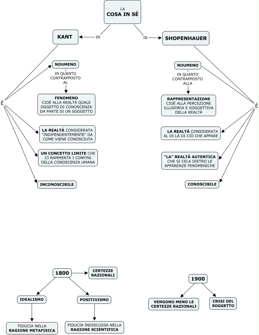 Questa Cmap, creata con IHMC CmapTools, contiene informazioni relative a: SHOPENHAUER, NOUMENO IN QUANTO CONTRAPPOSTO ALLA RAPPRESENTAZIONE CIOÉ ALLA PERCEZIONE ILLUSORIA E SOGGETTIVA DELLA REALTÀ, SHOPENHAUER È "LA" REALTÀ AUTENTICA CHE SI CELA DIETRO LE APPARENZE FENOMENICHE, 1900 ???? CRISI DEL SOGGETTO, LA COSA IN SÉ IN KANT, 1800 ???? IDEALISMO, NOUMENO IN QUANTO CONTRAPPOSTO AL FENOMENO CIOÉ ALLA REALTÀ QUALE OGGETTO DI CONOSCENZA DA PARTE DI UN SOGGETTO, POSITIVISMO ???? FIDUCIA INDISCUSSA NELLA RAGIONE SCIENTIFICA, KANT È INCONOSCIBILE, 1800 ???? CERTEZZE RAZIONALI, SHOPENHAUER È LA REALTÀ CONSIDERATA AL DI LÀ DI CIÒ CHE APPARE, LA COSA IN SÉ IN SHOPENHAUER, KANT È NOUMENO, IDEALISMO ???? FIDUCIA NELLA RAGIONE METAFISICA, SHOPENHAUER È NOUMENO, SHOPENHAUER È CONOSCIBILE, KANT È LA REALTÀ CONSIDERATA "INDIPENDENTEMENTE" DA COME VIENE CONOSCIUTA, 1900 ???? VENGONO MENO LE CERTEZZE RAZIONALI, 1800 ???? POSITIVISMO, KANT È UN CONCETTO LIMITE CHE CI RAMMENTA I CONFINI DELLA CONOSCENZA UMANA