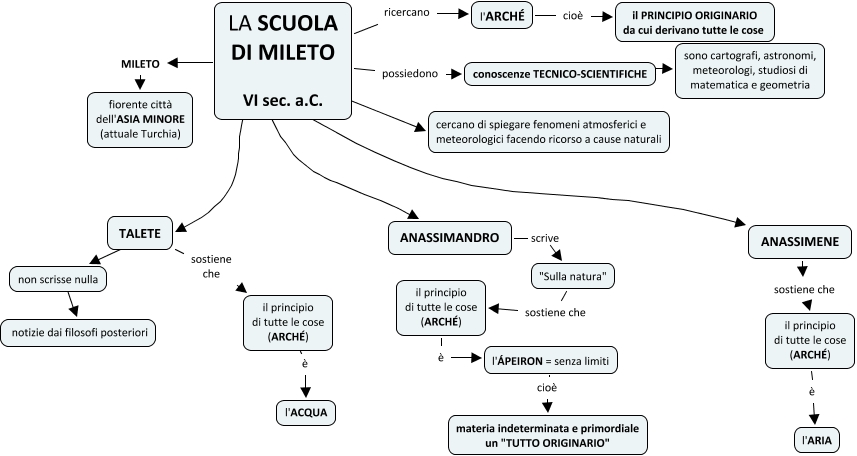 Questa Cmap, creata con IHMC CmapTools, contiene informazioni relative a: SCUOLA MILETO semplificato, l'ÁPEIRON = senza limiti cioè materia indeterminata e primordiale un "TUTTO ORIGINARIO", LA SCUOLA DI MILETO VI sec. a.C. possiedono conoscenze TECNICO-SCIENTIFICHE, TALETE ???? non scrisse nulla, il principio di tutte le cose (ARCHÉ) è l'ACQUA, LA SCUOLA DI MILETO VI sec. a.C. TALETE, "Sulla natura" sostiene che il principio di tutte le cose (ARCHÉ), LA SCUOLA DI MILETO VI sec. a.C. ???? ANASSIMENE, LA SCUOLA DI MILETO VI sec. a.C. ???? ANASSIMANDRO, LA SCUOLA DI MILETO VI sec. a.C. ricercano l'ARCHÉ, non scrisse nulla ???? notizie dai filosofi posteriori, TALETE sostiene che il principio di tutte le cose (ARCHÉ), il principio di tutte le cose (ARCHÉ) è l'ÁPEIRON = senza limiti, LA SCUOLA DI MILETO VI sec. a.C. ???? cercano di spiegare fenomeni atmosferici e meteorologici facendo ricorso a cause naturali, l'ARCHÉ cioè il PRINCIPIO ORIGINARIO da cui derivano tutte le cose, ANASSIMENE sostiene che il principio di tutte le cose (ARCHÉ), ANASSIMANDRO scrive "Sulla natura", il principio di tutte le cose (ARCHÉ) è l'ARIA, LA SCUOLA DI MILETO VI sec. a.C. MILETO fiorente città dell'ASIA MINORE (attuale Turchia), conoscenze TECNICO-SCIENTIFICHE ???? sono cartografi, astronomi, meteorologi, studiosi di matematica e geometria
