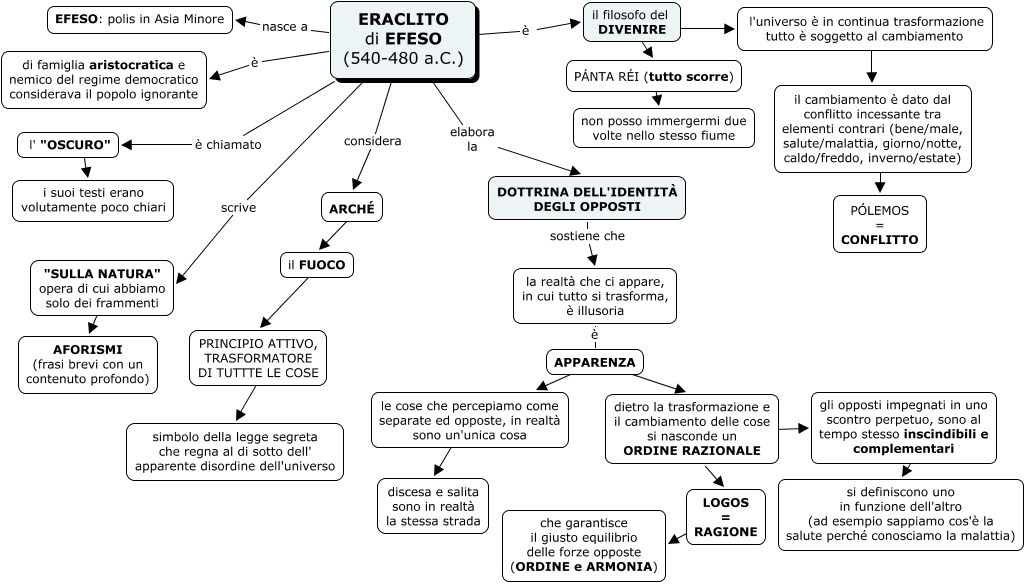 Questa Cmap, creata con IHMC CmapTools, contiene informazioni relative a: ERACLITO, dietro la trasformazione e il cambiamento delle cose si nasconde un ORDINE RAZIONALE ???? gli opposti impegnati in uno scontro perpetuo, sono al tempo stesso inscindibili e complementari, l'universo è in continua trasformazione tutto è soggetto al cambiamento ???? il cambiamento è dato dal conflitto incessante tra elementi contrari (bene/male, salute/malattia, giorno/notte, caldo/freddo, inverno/estate), ARCHÉ ???? il FUOCO, ERACLITO di EFESO (540-480 a.C.) elabora la DOTTRINA DELL'IDENTITÀ DEGLI OPPOSTI, PÁNTA RÉI (tutto scorre) ???? non posso immergermi due volte nello stesso fiume, la realtà che ci appare, in cui tutto si trasforma, è illusoria è APPARENZA, LOGOS = RAGIONE ???? che garantisce il giusto equilibrio delle forze opposte (ORDINE e ARMONIA), APPARENZA ???? le cose che percepiamo come separate ed opposte, in realtà sono un'unica cosa, ERACLITO di EFESO (540-480 a.C.) scrive "SULLA NATURA" opera di cui abbiamo solo dei frammenti, "SULLA NATURA" opera di cui abbiamo solo dei frammenti ???? AFORISMI (frasi brevi con un contenuto profondo), DOTTRINA DELL'IDENTITÀ DEGLI OPPOSTI sostiene che la realtà che ci appare, in cui tutto si trasforma, è illusoria, le cose che percepiamo come separate ed opposte, in realtà sono un'unica cosa ???? discesa e salita sono in realtà la stessa strada, ERACLITO di EFESO (540-480 a.C.) è di famiglia aristocratica e nemico del regime democratico considerava il popolo ignorante, il FUOCO ???? PRINCIPIO ATTIVO, TRASFORMATORE DI TUTTTE LE COSE, l' "OSCURO" ???? i suoi testi erano volutamente poco chiari, gli opposti impegnati in uno scontro perpetuo, sono al tempo stesso inscindibili e complementari ???? si definiscono uno in funzione dell'altro (ad esempio sappiamo cos'è la salute perché conosciamo la malattia), ERACLITO di EFESO (540-480 a.C.) è chiamato l' "OSCURO", dietro la trasformazione e il cambiamento delle cose si nasconde un ORDINE RAZIONALE ???? LOGOS = RAGIONE, ERACLITO di EFESO (540-480 a.C.) considera ARCHÉ, PRINCIPIO ATTIVO, TRASFORMATORE DI TUTTTE LE COSE ???? simbolo della legge segreta che regna al di sotto dell' apparente disordine dell'universo