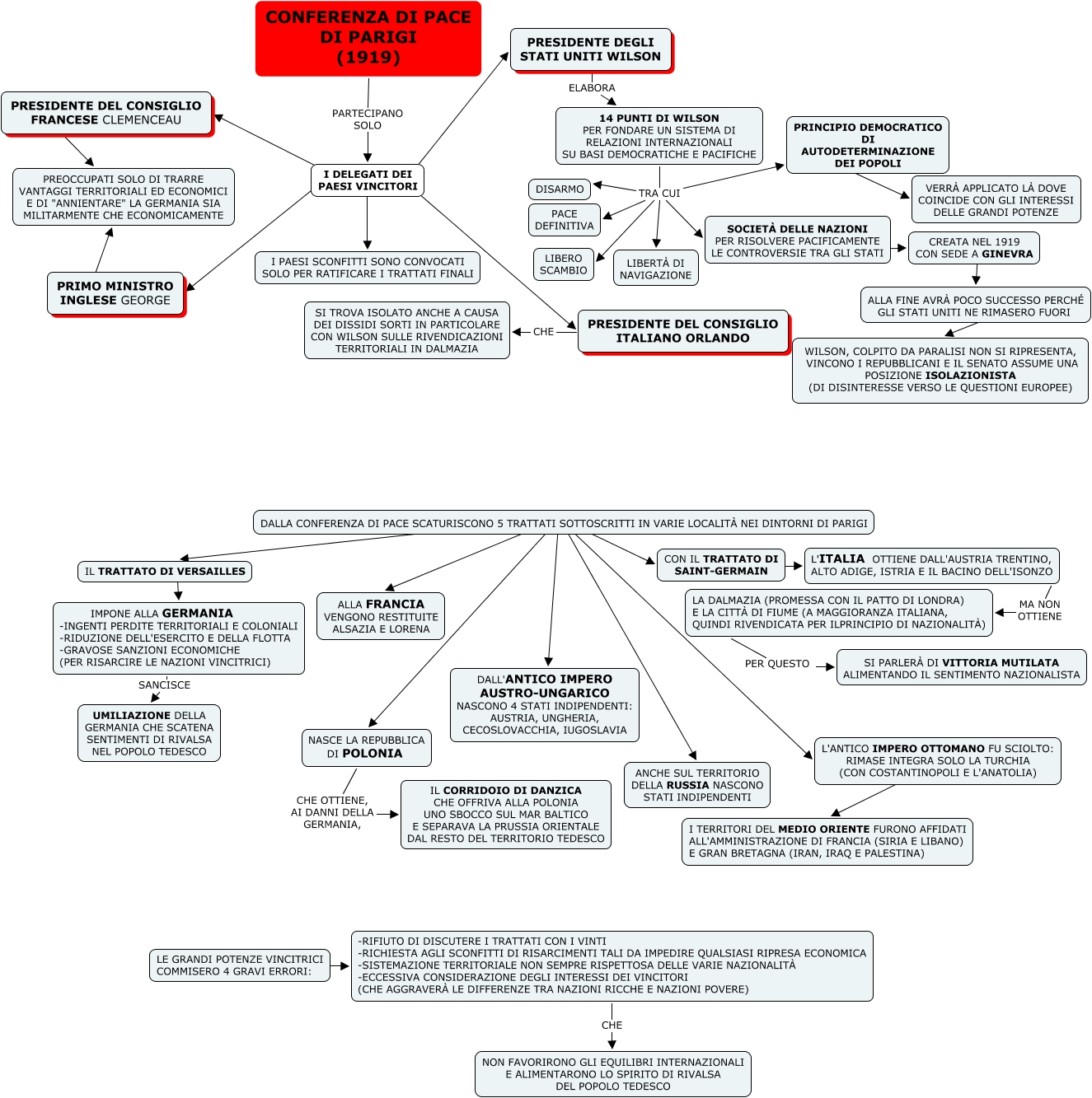 Questa Cmap, creata con IHMC CmapTools, contiene informazioni relative a: PRIMO DOPOGUERRA-i trattai di pace, I DELEGATI DEI PAESI VINCITORI ???? PRIMO MINISTRO INGLESE GEORGE, PRESIDENTE DEL CONSIGLIO FRANCESE CLEMENCEAU ???? PREOCCUPATI SOLO DI TRARRE VANTAGGI TERRITORIALI ED ECONOMICI E DI "ANNIENTARE" LA GERMANIA SIA MILITARMENTE CHE ECONOMICAMENTE, SOCIETÀ DELLE NAZIONI PER RISOLVERE PACIFICAMENTE LE CONTROVERSIE TRA GLI STATI ???? CREATA NEL 1919 CON SEDE A GINEVRA, CON IL TRATTATO DI SAINT-GERMAIN ???? L'ITALIA OTTIENE DALL'AUSTRIA TRENTINO, ALTO ADIGE, ISTRIA E IL BACINO DELL'ISONZO, PRESIDENTE DEGLI STATI UNITI WILSON ELABORA 14 PUNTI DI WILSON PER FONDARE UN SISTEMA DI RELAZIONI INTERNAZIONALI SU BASI DEMOCRATICHE E PACIFICHE, I DELEGATI DEI PAESI VINCITORI ???? I PAESI SCONFITTI SONO CONVOCATI SOLO PER RATIFICARE I TRATTATI FINALI, ALLA FINE AVRÀ POCO SUCCESSO PERCHÉ GLI STATI UNITI NE RIMASERO FUORI ???? WILSON, COLPITO DA PARALISI NON SI RIPRESENTA, VINCONO I REPUBBLICANI E IL SENATO ASSUME UNA POSIZIONE ISOLAZIONISTA (DI DISINTERESSE VERSO LE QUESTIONI EUROPEE), 14 PUNTI DI WILSON PER FONDARE UN SISTEMA DI RELAZIONI INTERNAZIONALI SU BASI DEMOCRATICHE E PACIFICHE TRA CUI DISARMO, DALLA CONFERENZA DI PACE SCATURISCONO 5 TRATTATI SOTTOSCRITTI IN VARIE LOCALITÀ NEI DINTORNI DI PARIGI ???? CON IL TRATTATO DI SAINT-GERMAIN, 14 PUNTI DI WILSON PER FONDARE UN SISTEMA DI RELAZIONI INTERNAZIONALI SU BASI DEMOCRATICHE E PACIFICHE TRA CUI SOCIETÀ DELLE NAZIONI PER RISOLVERE PACIFICAMENTE LE CONTROVERSIE TRA GLI STATI, DALLA CONFERENZA DI PACE SCATURISCONO 5 TRATTATI SOTTOSCRITTI IN VARIE LOCALITÀ NEI DINTORNI DI PARIGI ???? NASCE LA REPUBBLICA DI POLONIA, IL TRATTATO DI VERSAILLES ???? IMPONE ALLA GERMANIA -INGENTI PERDITE TERRITORIALI E COLONIALI -RIDUZIONE DELL'ESERCITO E DELLA FLOTTA -GRAVOSE SANZIONI ECONOMICHE (PER RISARCIRE LE NAZIONI VINCITRICI), L'ITALIA OTTIENE DALL'AUSTRIA TRENTINO, ALTO ADIGE, ISTRIA E IL BACINO DELL'ISONZO MA NON OTTIENE LA DALMAZIA (PROMESSA CON IL PATTO DI LONDRA) E LA CITTÀ DI FIUME (A MAGGIORANZA ITALIANA, QUINDI RIVENDICATA PER ILPRINCIPIO DI NAZIONALITÀ), I DELEGATI DEI PAESI VINCITORI ???? PRESIDENTE DEGLI STATI UNITI WILSON, 14 PUNTI DI WILSON PER FONDARE UN SISTEMA DI RELAZIONI INTERNAZIONALI SU BASI DEMOCRATICHE E PACIFICHE TRA CUI PACE DEFINITIVA, -RIFIUTO DI DISCUTERE I TRATTATI CON I VINTI -RICHIESTA AGLI SCONFITTI DI RISARCIMENTI TALI DA IMPEDIRE QUALSIASI RIPRESA ECONOMICA -SISTEMAZIONE TERRITORIALE NON SEMPRE RISPETTOSA DELLE VARIE NAZIONALITÀ -ECCESSIVA CONSIDERAZIONE DEGLI INTERESSI DEI VINCITORI (CHE AGGRAVERÀ LE DIFFERENZE TRA NAZIONI RICCHE E NAZIONI POVERE) CHE NON FAVORIRONO GLI EQUILIBRI INTERNAZIONALI E ALIMENTARONO LO SPIRITO DI RIVALSA DEL POPOLO TEDESCO, PRINCIPIO DEMOCRATICO DI AUTODETERMINAZIONE DEI POPOLI ???? VERRÀ APPLICATO LÀ DOVE COINCIDE CON GLI INTERESSI DELLE GRANDI POTENZE, DALLA CONFERENZA DI PACE SCATURISCONO 5 TRATTATI SOTTOSCRITTI IN VARIE LOCALITÀ NEI DINTORNI DI PARIGI ???? IL TRATTATO DI VERSAILLES, I DELEGATI DEI PAESI VINCITORI ???? PRESIDENTE DEL CONSIGLIO ITALIANO ORLANDO, L'ANTICO IMPERO OTTOMANO FU SCIOLTO: RIMASE INTEGRA SOLO LA TURCHIA (CON COSTANTINOPOLI E L'ANATOLIA) ???? I TERRITORI DEL MEDIO ORIENTE FURONO AFFIDATI ALL'AMMINISTRAZIONE DI FRANCIA (SIRIA E LIBANO) E GRAN BRETAGNA (IRAN, IRAQ E PALESTINA)