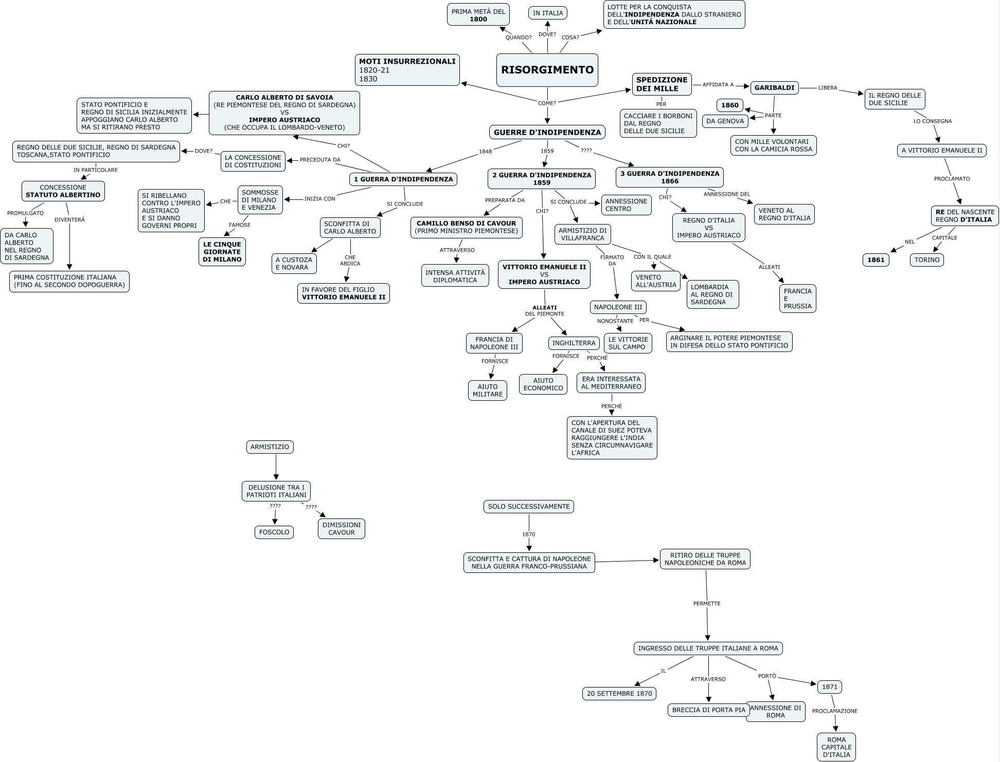Questa Cmap, creata con IHMC CmapTools, contiene informazioni relative a: RISORGIMENTO, CARLO ALBERTO DI SAVOIA (RE PIEMONTESE DEL REGNO DI SARDEGNA) VS IMPERO AUSTRIACO (CHE OCCUPA IL LOMBARDO-VENETO) ???? STATO PONTIFICIO E REGNO DI SICILIA INIZIALMENTE APPOGGIANO CARLO ALBERTO MA SI RITIRANO PRESTO, 3 GUERRA D'INDIPENDENZA 1866 ANNESSIONE DEL VENETO AL REGNO D'ITALIA, ARMISTIZIO DI VILLAFRANCA CON IL QUALE VENETO ALL'AUSTRIA, 2 GUERRA D'INDIPENDENZA 1859 CHI? VITTORIO EMANUELE II VS IMPERO AUSTRIACO, INGRESSO DELLE TRUPPE ITALIANE A ROMA ATTRAVERSO BRECCIA DI PORTA PIA, SCONFITTA E CATTURA DI NAPOLEONE NELLA GUERRA FRANCO-PRUSSIANA ???? RITIRO DELLE TRUPPE NAPOLEONICHE DA ROMA, INGRESSO DELLE TRUPPE ITALIANE A ROMA PORTÒ 1871, DELUSIONE TRA I PATRIOTI ITALIANI ???? DIMISSIONI CAVOUR, RISORGIMENTO COME? GUERRE D'INDIPENDENZA, SOLO SUCCESSIVAMENTE 1870 SCONFITTA E CATTURA DI NAPOLEONE NELLA GUERRA FRANCO-PRUSSIANA, INGRESSO DELLE TRUPPE ITALIANE A ROMA PORTÒ ANNESSIONE DI ROMA, CAMILLO BENSO DI CAVOUR (PRIMO MINISTRO PIEMONTESE) ATTRAVERSO INTENSA ATTIVITÀ DIPLOMATICA, GARIBALDI PARTE DA GENOVA, REGNO D'ITALIA VS IMPERO AUSTRIACO ALLEATI FRANCIA E PRUSSIA, ARMISTIZIO DI VILLAFRANCA CON IL QUALE LOMBARDIA AL REGNO DI SARDEGNA, RE DEL NASCENTE REGNO D'ITALIA NEL 1861, 2 GUERRA D'INDIPENDENZA 1859 PREPARATA DA CAMILLO BENSO DI CAVOUR (PRIMO MINISTRO PIEMONTESE), GUERRE D'INDIPENDENZA 1859 2 GUERRA D'INDIPENDENZA 1859, GUERRE D'INDIPENDENZA 1848 1 GUERRA D'INDIPENDENZA, NAPOLEONE III PER ARGINARE IL POTERE PIEMONTESE IN DIFESA DELLO STATO PONTIFICIO