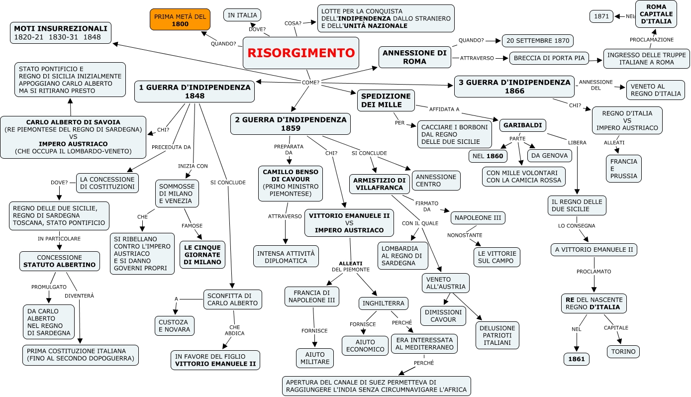 Questa Cmap, creata con IHMC CmapTools, contiene informazioni relative a: RISORGIMENTO BOZZA, GARIBALDI PARTE NEL 1860, GARIBALDI PARTE CON MILLE VOLONTARI CON LA CAMICIA ROSSA, 1 GUERRA D'INDIPENDENZA 1848 CHI? CARLO ALBERTO DI SAVOIA (RE PIEMONTESE DEL REGNO DI SARDEGNA) VS IMPERO AUSTRIACO (CHE OCCUPA IL LOMBARDO-VENETO), CAMILLO BENSO DI CAVOUR (PRIMO MINISTRO PIEMONTESE) ATTRAVERSO INTENSA ATTIVITÀ DIPLOMATICA, VENETO ALL'AUSTRIA ???? DIMISSIONI CAVOUR, INGHILTERRA FORNISCE AIUTO ECONOMICO, SCONFITTA DI CARLO ALBERTO A CUSTOZA E NOVARA, CONCESSIONE STATUTO ALBERTINO DIVENTERÀ PRIMA COSTITUZIONE ITALIANA (FINO AL SECONDO DOPOGUERRA), RISORGIMENTO COME? SPEDIZIONE DEI MILLE, 2 GUERRA D'INDIPENDENZA 1859 SI CONCLUDE ANNESSIONE CENTRO, RISORGIMENTO COME? MOTI INSURREZIONALI 1820-21 1830-31 1848, RISORGIMENTO COME? 3 GUERRA D'INDIPENDENZA 1866, SPEDIZIONE DEI MILLE AFFIDATA A GARIBALDI, ANNESSIONE DI ROMA QUANDO? 20 SETTEMBRE 1870, LA CONCESSIONE DI COSTITUZIONI DOVE? REGNO DELLE DUE SICILIE, REGNO DI SARDEGNA TOSCANA, STATO PONTIFICIO, 1 GUERRA D'INDIPENDENZA 1848 INIZIA CON SOMMOSSE DI MILANO E VENEZIA, SCONFITTA DI CARLO ALBERTO CHE ABDICA IN FAVORE DEL FIGLIO VITTORIO EMANUELE II, 2 GUERRA D'INDIPENDENZA 1859 SI CONCLUDE ARMISTIZIO DI VILLAFRANCA, FRANCIA DI NAPOLEONE III FORNISCE AIUTO MILITARE, REGNO D'ITALIA VS IMPERO AUSTRIACO ALLEATI FRANCIA E PRUSSIA