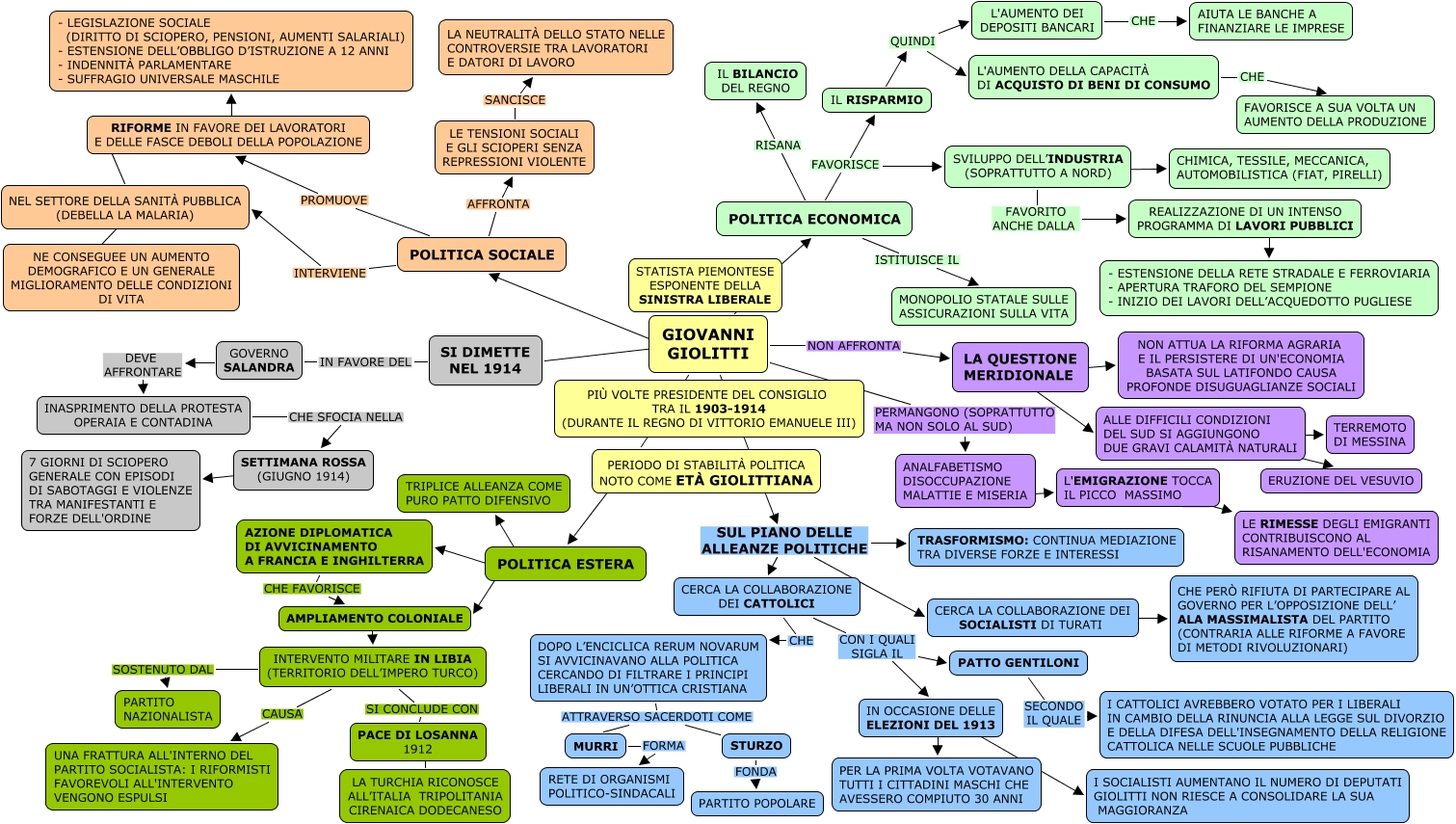 Questa Cmap, creata con IHMC CmapTools, contiene informazioni relative a: GIOLITTI colori, L'AUMENTO DELLA CAPACITÀ DI ACQUISTO DI BENI DI CONSUMO CHE FAVORISCE A SUA VOLTA UN AUMENTO DELLA PRODUZIONE, GIOVANNI GIOLITTI SUL PIANO DELLE ALLEANZE POLITICHE CERCA LA COLLABORAZIONE DEI SOCIALISTI DI TURATI, GIOVANNI GIOLITTI ???? POLITICA ECONOMICA, LE TENSIONI SOCIALI E GLI SCIOPERI SENZA REPRESSIONI VIOLENTE SANCISCE LA NEUTRALITÀ DELLO STATO NELLE CONTROVERSIE TRA LAVORATORI E DATORI DI LAVORO, IL RISPARMIO QUINDI L'AUMENTO DELLA CAPACITÀ DI ACQUISTO DI BENI DI CONSUMO, ALLE DIFFICILI CONDIZIONI DEL SUD SI AGGIUNGONO DUE GRAVI CALAMITÀ NATURALI ???? ERUZIONE DEL VESUVIO, RIFORME IN FAVORE DEI LAVORATORI E DELLE FASCE DEBOLI DELLA POPOLAZIONE ???? NEL SETTORE DELLA SANITÀ PUBBLICA (DEBELLA LA MALARIA), SVILUPPO DELL’INDUSTRIA (SOPRATTUTTO A NORD) FAVORITO ANCHE DALLA REALIZZAZIONE DI UN INTENSO PROGRAMMA DI LAVORI PUBBLICI, GIOVANNI GIOLITTI SUL PIANO DELLE ALLEANZE POLITICHE TRASFORMISMO: CONTINUA MEDIAZIONE TRA DIVERSE FORZE E INTERESSI, CERCA LA COLLABORAZIONE DEI CATTOLICI CON I QUALI SIGLA IL IN OCCASIONE DELLE ELEZIONI DEL 1913, LA QUESTIONE MERIDIONALE ???? ALLE DIFFICILI CONDIZIONI DEL SUD SI AGGIUNGONO DUE GRAVI CALAMITÀ NATURALI, POLITICA ECONOMICA FAVORISCE SVILUPPO DELL’INDUSTRIA (SOPRATTUTTO A NORD), GOVERNO SALANDRA DEVE AFFRONTARE INASPRIMENTO DELLA PROTESTA OPERAIA E CONTADINA, LA QUESTIONE MERIDIONALE ???? NON ATTUA LA RIFORMA AGRARIA E IL PERSISTERE DI UN'ECONOMIA BASATA SUL LATIFONDO CAUSA PROFONDE DISUGUAGLIANZE SOCIALI, AMPLIAMENTO COLONIALE ???? INTERVENTO MILITARE IN LIBIA (TERRITORIO DELL’IMPERO TURCO), POLITICA SOCIALE PROMUOVE RIFORME IN FAVORE DEI LAVORATORI E DELLE FASCE DEBOLI DELLA POPOLAZIONE, SI DIMETTE NEL 1914 IN FAVORE DEL GOVERNO SALANDRA, L'EMIGRAZIONE TOCCA IL PICCO MASSIMO ???? LE RIMESSE DEGLI EMIGRANTI CONTRIBUISCONO AL RISANAMENTO DELL'ECONOMIA, ALLE DIFFICILI CONDIZIONI DEL SUD SI AGGIUNGONO DUE GRAVI CALAMITÀ NATURALI ???? TERREMOTO DI MESSINA, ANALFABETISMO DISOCCUPAZIONE MALATTIE E MISERIA ???? L'EMIGRAZIONE TOCCA IL PICCO MASSIMO